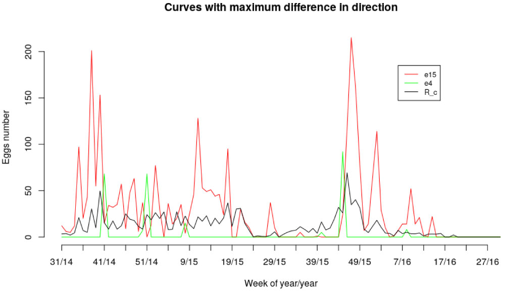Figure 4: Curves with maximum difference in direction (curves of ovitraps e15 and e4). The reference curve (Rc) is also shown.