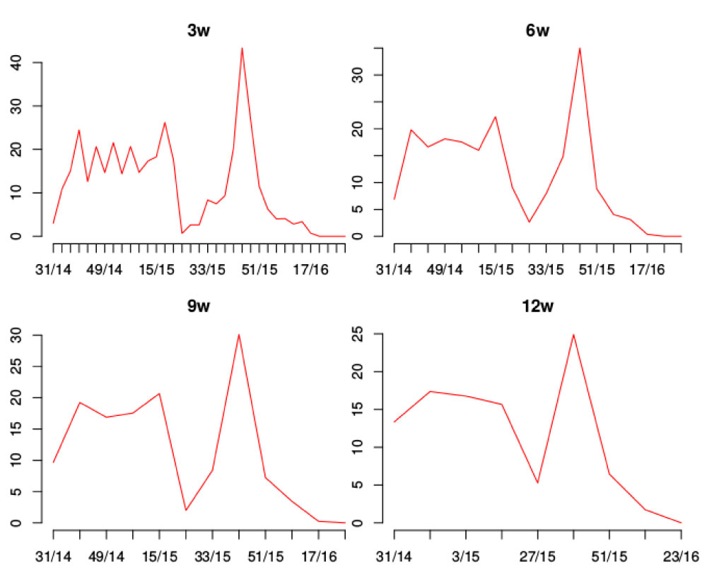 Figure 5: Reference curve according to the different temporary resolutions: 3w, 6w, 9w, 12w. Horizontal axis shows week of year/year marks. Vertical axis shows egg number.