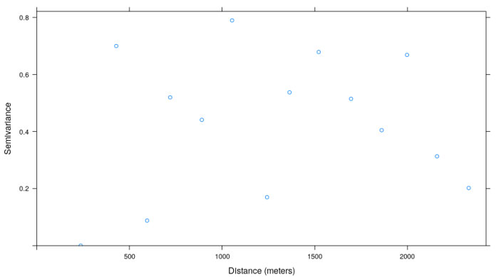 At a minimum TR (only one week of the two years is sampled) the spatial regionalized structure is eliminated as shown in the variogram of Figure 6. The information structure for the spherical model is vanished. Therefore, complete spatial randomness is presented and, consequently, it is not possible to generate an interpolated map at a TR of less than 2 weeks.