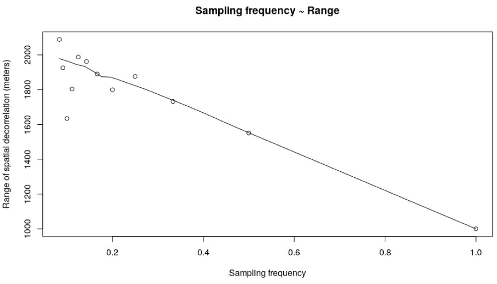 When varying the time scale of analysis, the spatial scale should be modified accordingly to adapt it to the new data structure. A spatial pattern that was analyzed every 1000 m at a certain resolution or time scale may not be relevant at another time scale. At lower TR, the required distance of no correlation between ovitraps increases.