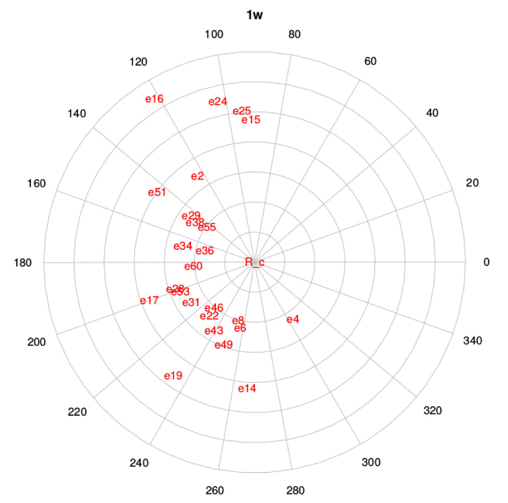 Figure 9: Polar graph corresponding to the polar coordinates (ρRc,r and αRc,r ) of distance between curves. e stands for external because it corresponds to the curves of the outdoor ovitraps and the number refers to the site number (r).