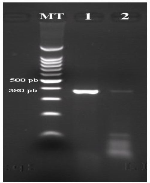 Figure 1: Products of "hex" gene amplification of adenovirus before and after optimization of the extraction revelation with 2% agarose gel.