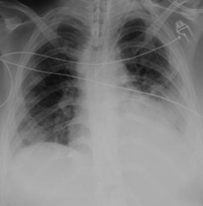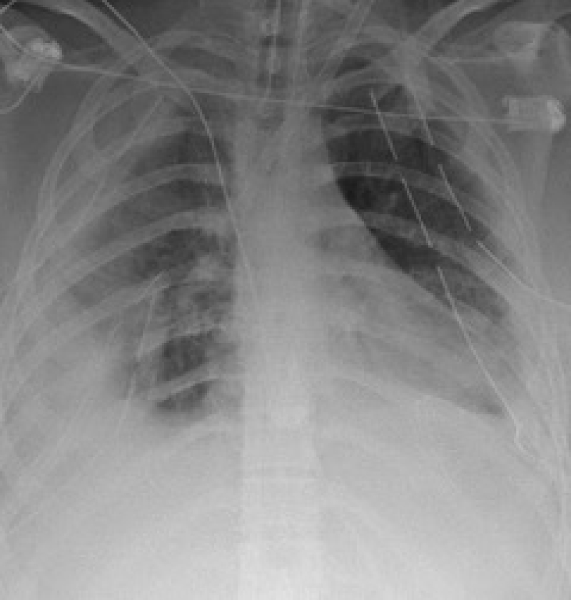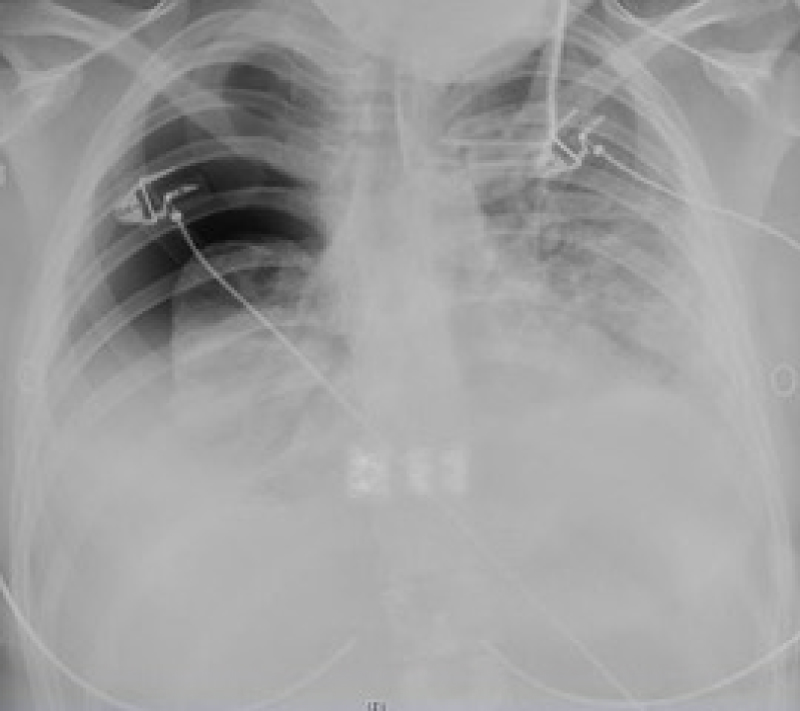 The case is presented of a 21-year-old female who initially presented with a sore throat and productive cough. She had previously been seen by a doctor in a primary care setting who diagnosed tonsillitis and commenced her on oral antibiotics. She had a background of recurrent chest and ear infections over the last few months, but no co-morbidities. She deteriorated significantly over the next twenty-four hours and was taken to her local Emergency Department (ED) by ambulance. Her presenting symptoms were vomiting, shortness of breath, and a cough productive of green sputum. On admission was found to be pyrexial, hypotensive, tachycardic and hypoxic. She was drowsy and had mottled extremities. A chest radiograph performed in the ED demonstrated left sided consolidation and right sided hydropneumothorax (Figure 1).