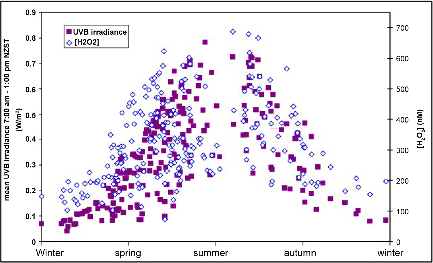 Figure 3: H2O2 seasonal variation in surface water and UVB in New Zealand.