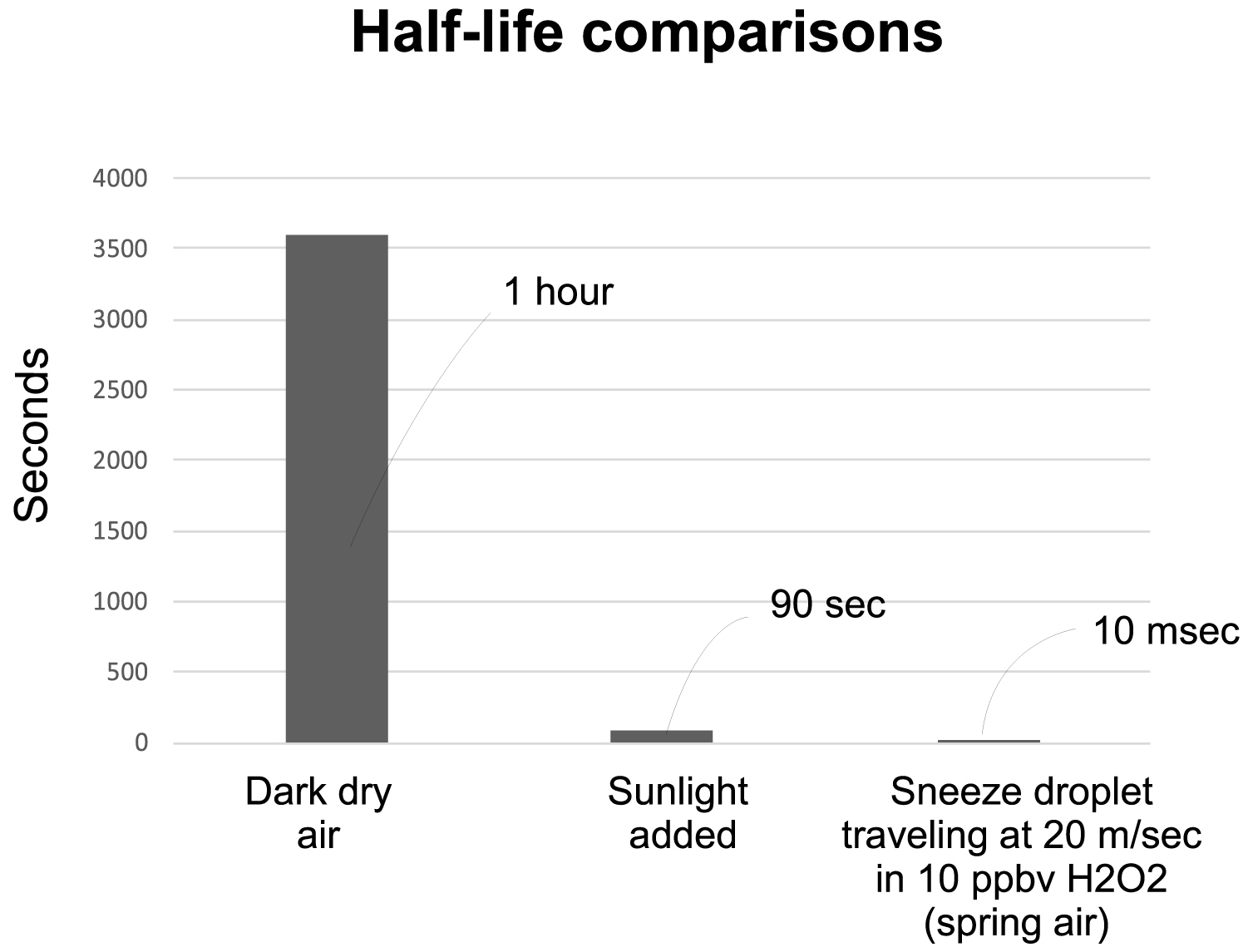 As shown by Marsden [5] a sneeze traveling through 10 ppbv hydrogen peroxide atmosphere kills 99% of the viruses in the sneeze droplets within a meter. Given sneeze velocity are greater than 20 m/s, half-life of less than a second appear realistic for the condition where droplets are in motion within low level germicidal atmospheres.