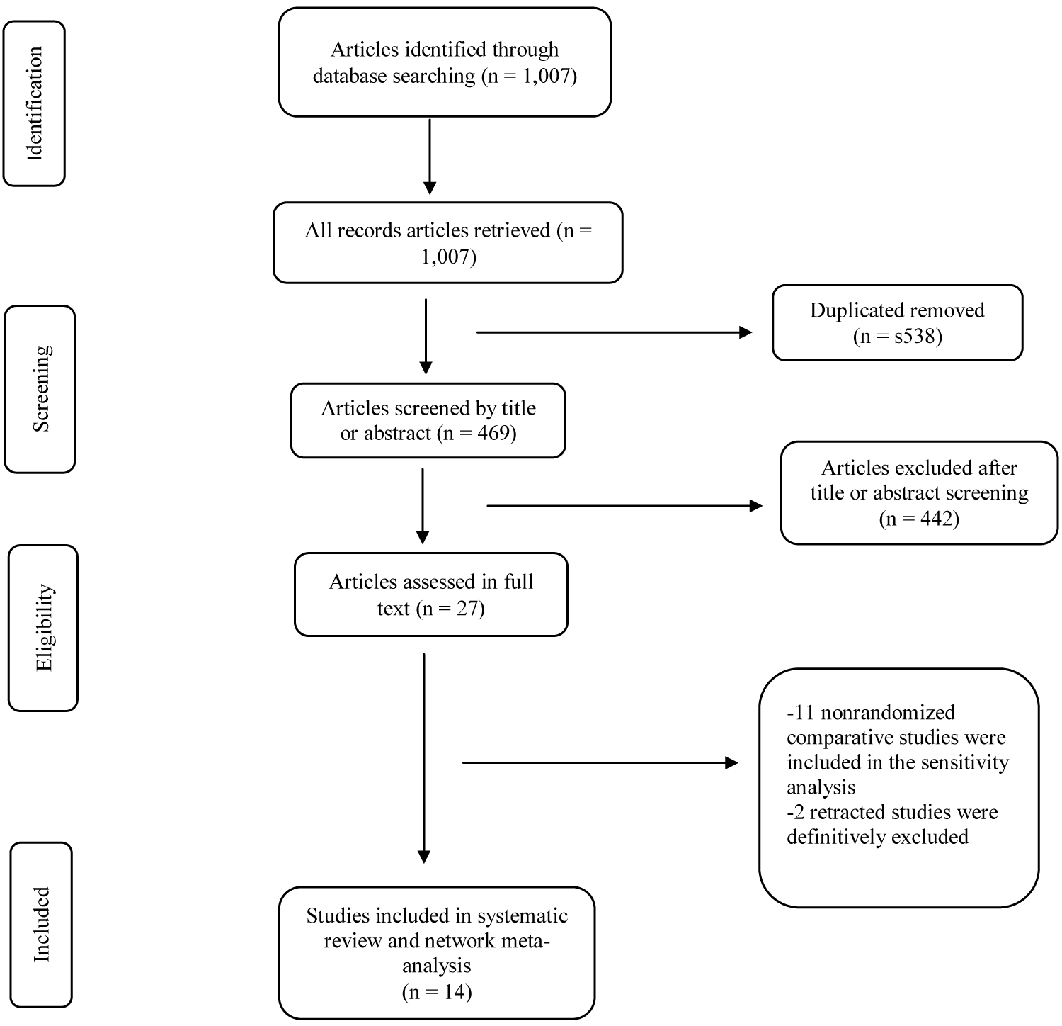 The initial search through all database identified 1,007 citations, of which 469 were screened by title and abstract after removing duplicates. Of the 27 full-text citations reviewed, 14 RCTs [3-5,16-26] that met the inclusion criteria were finally included in the quantitative network meta-analysis (Figure 1). These 14 RCTs (two phase 2 and five blinded) included together 2,898 patients infected by the SARS-CoV-2 virus with mean age between 44.7 and 70 years, and 1,731 [59.7%] were men, and followed from 6 to 28 days. 1,656 (57.1%) patients had comorbidity with the most common were hypertension (1,029; 35.5%) and diabetes (627; 21.6%).