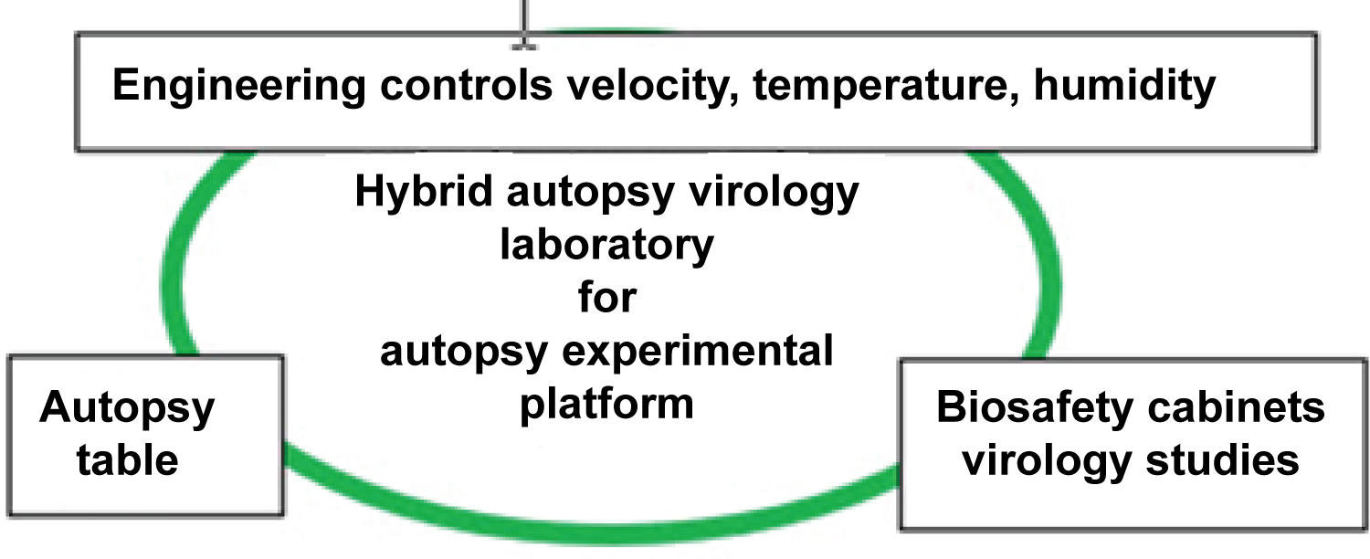 Instead of a patient's bed, an autopsy table in the morgue can form part of a hybrid autopsy virology laboratory as an investigative experimental platform equipped with the necessary instruments for collecting material for virology studies (Figure 1). The autopsy room's engineering controls can provide the necessary conditions for manipulating the air flow, temperature, and humidity. It is not necessary for all components of the hybrid autopsy virology laboratory to be located in the same room as aerosol-capturing devices. The rest of the equipment can be in adjacent rooms or even further away if the technology allows.