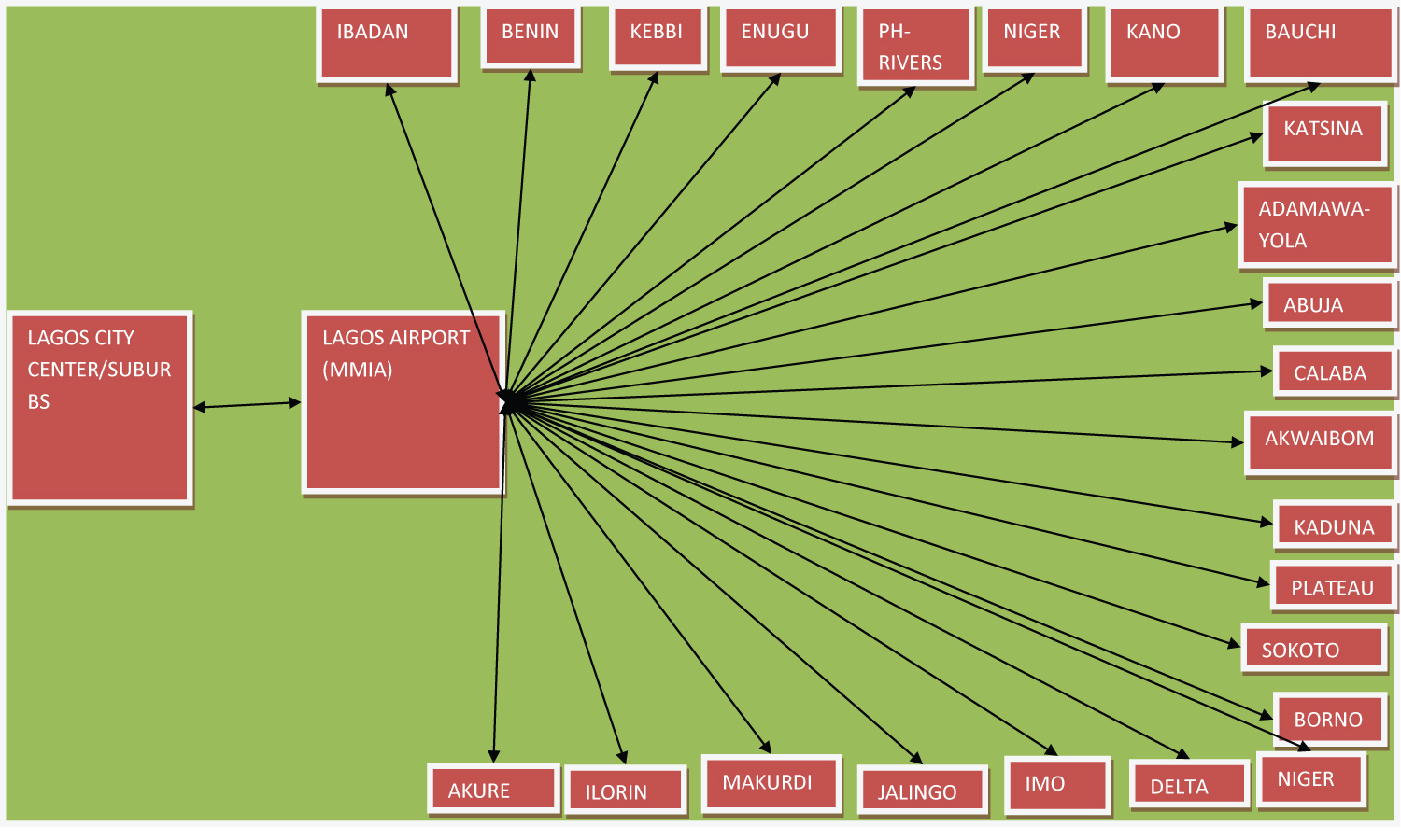 The identified travel infective pathways between Lagos and other states in various regions is best used to explained the aggregation of exposure risks as individual travelers interact between spatial locations by physically transiting through them. For example, by a physical travel interaction from Lagos to Abuja, a traveler accumulates an aggregate exposure to the spread of covid-19 pandemic equivalent to the sum of the exposure risk faced in each of his travel from Lagos urban center and/or suburbs to Lagos airport and travels from Abuja urban center and/or suburbs to Abuja airport as indicated in the Figure 2. See Table 2 for individual travelers' exposure to the spread of covid-19 as a result of travels interactions in both Lagos and other regional airport locations as well as travels interactions in Abuja and other regional airport locations.