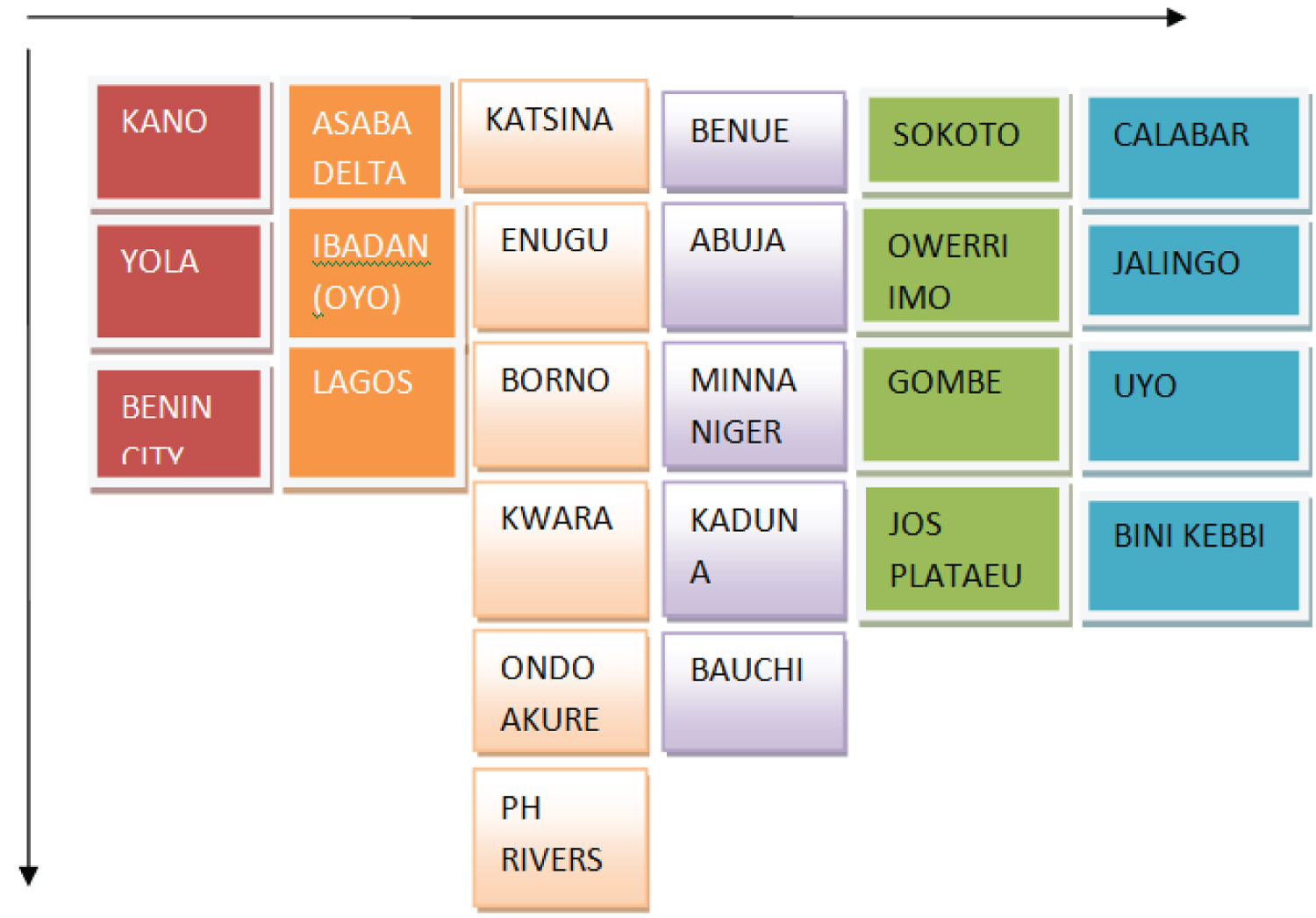 In the study, we used about 26 airports in located in Abuja, Lagos, Enugu, Kano, Calabar, Port-Harcourt, Kaduna, bauchi, Maiduguri, Sokoto, Jos, Yola, Kebbi, Asaba, Owerri, Gombe, Minna, Uyo, Katsina, Makurdi, Ibadan, Jalingo, Akure, Benin and Ilorin; in different states and regions of Nigeria, from which travelers currently access domestic flights. These different states currently have varied confirmed covid-19 cases based on empirical evidence from the NCDC [5]. The implication is that given the proximity of the airports to the city centers and suburbs, air travelers in Nigeria will certainly experience disproportionate rates of exposure to covid-19, which equally implies disproportionate degrees of vulnerability to covid-19, as they access air transport services in various airports in different airports in Nigeria. It is believed that once travelers are able to understand the level of exposure risk they face on travel pathways and take serious steps as provided in the covid-19 prevention guidelines by the WHO [6] to limit their individual vulnerability; the curve of transmission and spread of the covid-19 disease will be flattened and the disease prevented from spreading further as airlines and airports prepare to commence full flight operations in the coming weeks. In the study therefore, the major infective air travel pathways in individual airports in Nigeria will be identified and the risk of exposure to the spread of covid-19 posed by each identified air travel pathway estimated based on proximity metrics. Disproportionate exposure and vulnerability to the covid-19 pandemic determined will be used to develop a risk matrix and group the states and regions into low and high exposure risk zones for serious and proactive implementation of vulnerability limiting/reduction strategies and safety guidelines for air travels in the different airports locations in Nigeria.