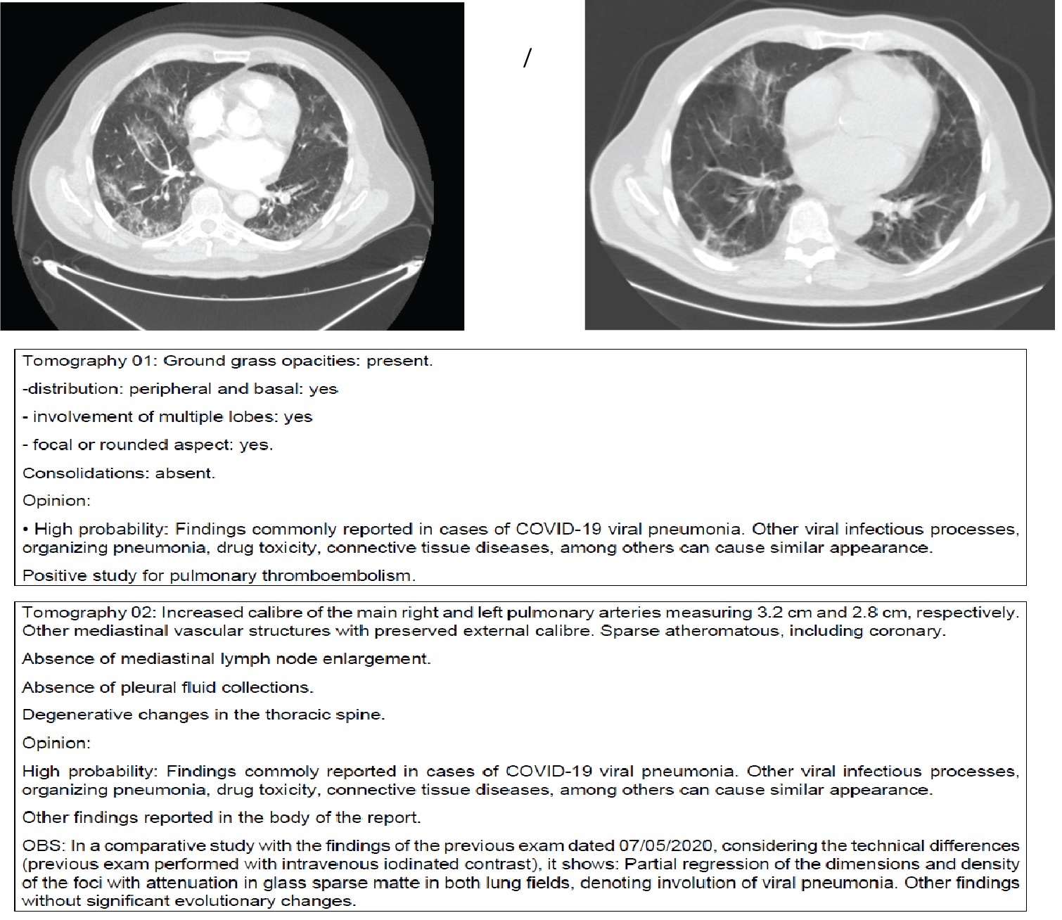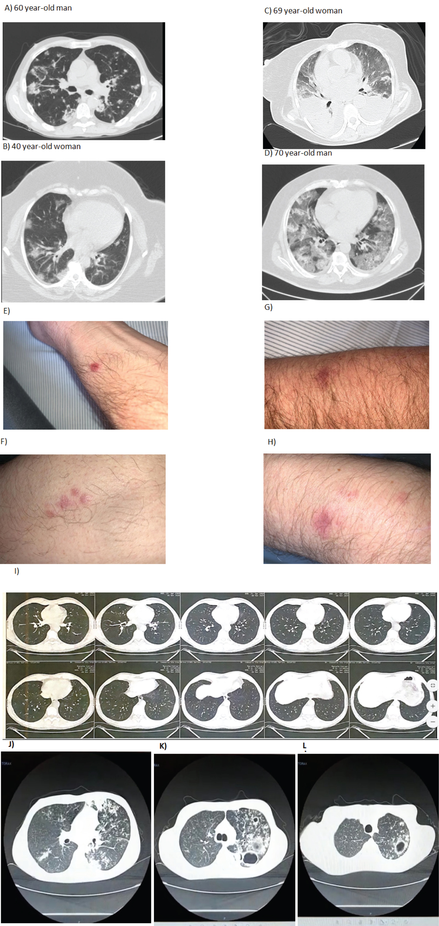 Figure 6A-D: After ICU stay and orotracheal intubation and readmitted in the Infectious Diseases wards. Obese and or Diabetic patients after 14 days of disease. (14-40 days). Observe the "heavy" pattern of the images with opacities denoting extensive posterior atelectasis or even condensation in the pulmonary parenchyma in a diffuse manner. This tomography is different from the acute COVID-19 in Figure 1, where we have a ground grass pattern that is lighter and more tenuous. We are readmitting patients who already arrive with a "heavy" image pattern with new decompensation. This patient is not acute COVID-19; he is only exacerbating a disease, usually a vasculitis triggered by acute SARS-CoV-2 infection. In this phase, the patient responds better to corticosteroids and the intubation time is usually shorter since there is an evident autoimmune component. Differentiating between acute COVID-19 or COVID-19 in a critical phase (cHIS) is essential, as the pathophysiology of the disease changes: Acute COVID-19: viral action. Chronic COVID-19: Immunosuppression and autoimmunity phase. Two data are necessary to understand whether the case is acute or not: 1- To ask the patient whether he has had respiratory decompensations in the last months and what the recurrence is or whether there has been any change in his behaviour or pain, or tiredness in the last months - this can mean COVID-19 that has not been previously diagnosed; 2- Observing tomography: heavy hard images with laminar atelectasis and thickening of bronchi and bronchioles: Chronic phase; A lighter image of infiltration in frosted glass: acute COVID-19. The pattern of pneumonia after COVID-19 has been acute fibrinous and organizing pneumonia (AFOP) that is a histological pattern characterized predominantly by the presence of intra-alveolar fibrin in the form of fibrin "balls" within the alveolar spaces, with a patchy distribution, and organizing pneumonia. E-H: Patient, 46-years-old, HIV+ with viral load always undetectable and CD4+ always higher than 600, started skin lesions associated with pruritus without improvement. He mentions having seen three other doctors who considered Kaposi's Sarcoma hypothesis. However, when asked about his last semester, the patient reported an essential change in mood. I note that the lesions can be due to mastocytosis after COVID-19 or even vasculitis. We started Dexamethasone equivalent to a 250 mg dose of Methylprednisolone for 3 days and de-escalating the dose for another 5 days. It evolves on the first day with many tremors that improved after the second day. It also evolves with the improvement of skin lesions. I associated acetylsalicylic acid thinking about platelet activation in case of vasculitis and request new tests. I: Tomography shows ectasia of the ascending aorta, accentuation of the centrilobular stipple and presence of bronchial thickening; CD8 + = 270 and CD4 + = 197. Tomography findings appear in vasculitis and other diseases of the parenchyma. Possible diagnoses: Vasculitis, mastocytosis. The patient will be reassessed for new Cd4+ and CD8+ and skin biopsy collections if there are new lesions. J-L: Young, male, 19-years-old. Admitted to HSPE due to dyspnoea for more than 8 days. IgM and IgG positive. At the time, we questioned granulomatosis with polyangiitis, but we were surprised to see a positive sputum smear for Mycobacteria tuberculosis. Reanalysing, this case should be recalled and seen by a new aspect: COVID-19 + induced vasculitis + activation of latent tuberculosis by immunoparalysis.