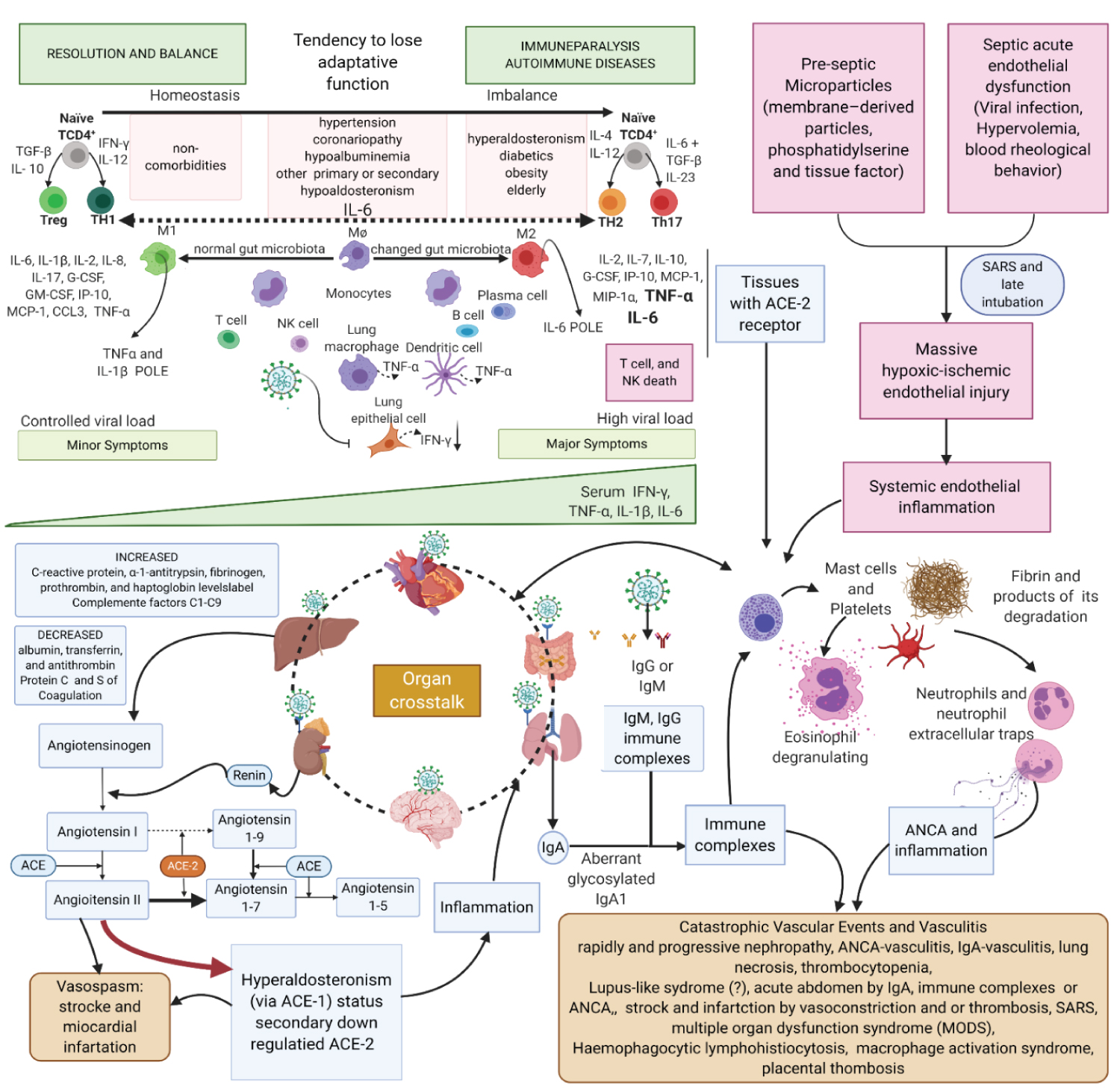 First Theory. Ischaemic mechanisms in COVID-19 physiopathology. Left upper Figure: Patients under certain conditions (elderly, obese, diabetic) have the innate immunity pathway more activated than adaptive immunity. Elderly, due to immunosenescence, have a natural decrease in TCR (T cell receptor) and B cells; obese patients show has activation of M2 macrophages M2 (anti-inflammatory) in to the detriment of M1 macrophages M1 (inflammatory) to balance inflammatory characteristics of comorbidity. Diabetic patients present glycosylation of the inflammatory pathways causing decrease in the adaptive immune response and an increase in the innate one. Some studies have already shown lasting IgA in high concentration in sera compared to IgM and IgG. IgA1 may be glycosylated differently, triggering production of autoantibodies forming immune complexes when they bind to serum IgA1. Right upper Figure: Sustained hypoxemic status and microparticles (MPs) also contribute to the worsening conditions in the endothelial inflammation. MPs are cell membrane-derived particles that can promote coagulation, inflammation, and angiogenesis and can participate in cell-to-cell communication. Sometimes late intubation can worsen existing inflammation. Lower Figure: Immune complexes are also formed in the opsonization process by IgM and IgG. Immune complexes start the cascade of kidney damage. IgA nephropathy has haematuria and proteinuria that can be massive in a stage of nephrotic syndrome. Erythrocytes are injured in the glomeruli and release chemotactic contents to the complement system, which increase the renal inflammatory response. IgA causes vasculitis and may explain Kawasaki syndrome in children, thrombotic events, and abdominal tenderness in adult patients. Hypercoagulative status is intense due to inflammation and increased production of procoagulant factors, such as fibrinogen, produced by the liver; or by the loss of anticoagulant elements, like protein S and protein C lost in nephrotic syndrome. ACE-2 receptor is down- regulated in the tissues due to infection by SARS-CoV-2; thus, the anti-inflammatory and vasodilatory pathway is impaired, diverting Renin-Angiotensin-Aldosterone System (RAAS) to aldosterone. In the kidneys, these effects with hyperactivated macrophages lead to a rapidly and progressive renal failure, as seen in severe cases. Serum immune complexes and their deposition in tissues activate complement system that induces mast cells degranulation (causing urticaria), attracting neutrophils to the inflamed tissue. Some studies have shown the action of neutrophil extracellular traps (NETs) on SARS-CoV-2 infection. NETs play an important role in the evolution of COVID-19 to severe forms, perhaps stimulating tissue necrosis, increasing local inflammation, leading the patient to present Severe Acute Respiratory Syndrome (SARS). NETs have the function of helping the organism in the control against infections, it seems to have an intensifying effect on B cells and act, in some way, in the polarization to TCD4+ of adaptive immunity. NETs are also related to the formation of antineutrophil cytoplasmic antibody (ANCA), which can cause vasculitis. Organ crosstalk is a mutual communication between distant organs to maintain the homeostasis. ACE-2 receptor is prevalent in human body and the inflammatory syndrome is not a unique organ syndrome, it is an important and intense talk between organs that explains the massive inflammatory response in COVID-19.