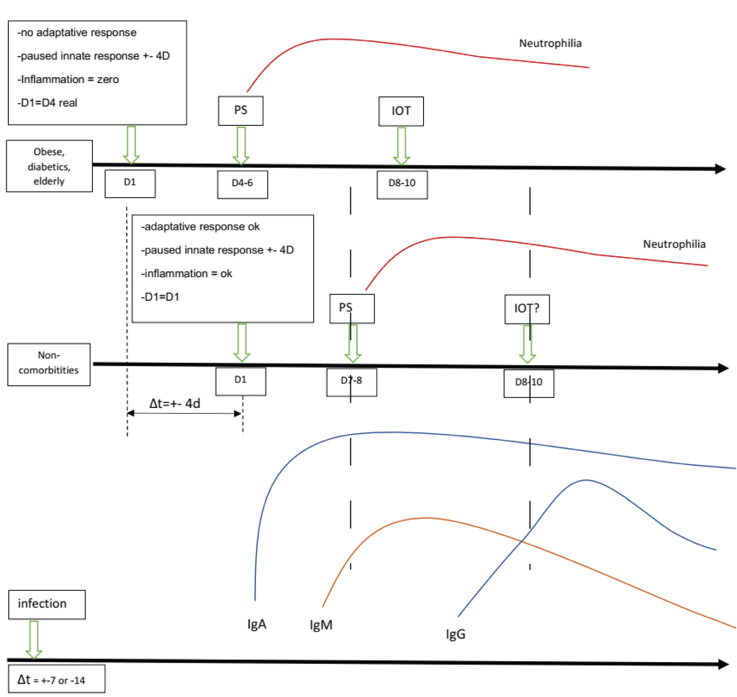 Figure 5: Paradoxical Theory "Back to the Present": The immune system is geared towards tolerance in people with inflammatory comorbidities and they will take a little longer to feel the effect of the inflammation or will present severe hypoxia when apparently, they seem well. Also, the elderly, diabetics and obese patients have a compromised adaptive system. When these patients are admitted reporting 3 or 4 days of symptoms, they have a chest tomography compatible with an evolution time of more than 7 days of illness. This population is highly vulnerable because of the lack of knowledge about the disease's pathophysiology has led these patients to have a delayed or not even performed intubation. SARS-CoV-2 pauses INF-γ at the beginning of de viraemic phase; D1 for comorbidities patients is actually D4 ( considering Tomography pattern); inflammatory comorbidities have a low inflammatory reaction due to paused INF-γ and poor adaptative response; these patients are in A SILENT VIREMIA and IN A SILENT HIPOXEMIA; Neutrophilic phase observed in a hemogram (pulmonary phase) appears in the same period in patients with inflammatory comorbidities and in non-inflammatory comorbidities, but what is shown is a delay of about 4 days between the two groups. D8 in comorbidities patients = D12 actually: we are not intubating these patients "in time." The virus tricked us. Intubating "in time" for comorbidities = intubating when patients arrive at thee.r if satO2 < 93%, since they are inwards about d7-d8 (when they are in D10-D12). The virus does not change the antibody kinetics changing our DNA in this case, but SARS-CoV-2 has mechanisms to polarize our immune system not to produce antibodies. PS = Emergency room, IOT = Orotracheal intubation, D4 = day 4 after symptoms.