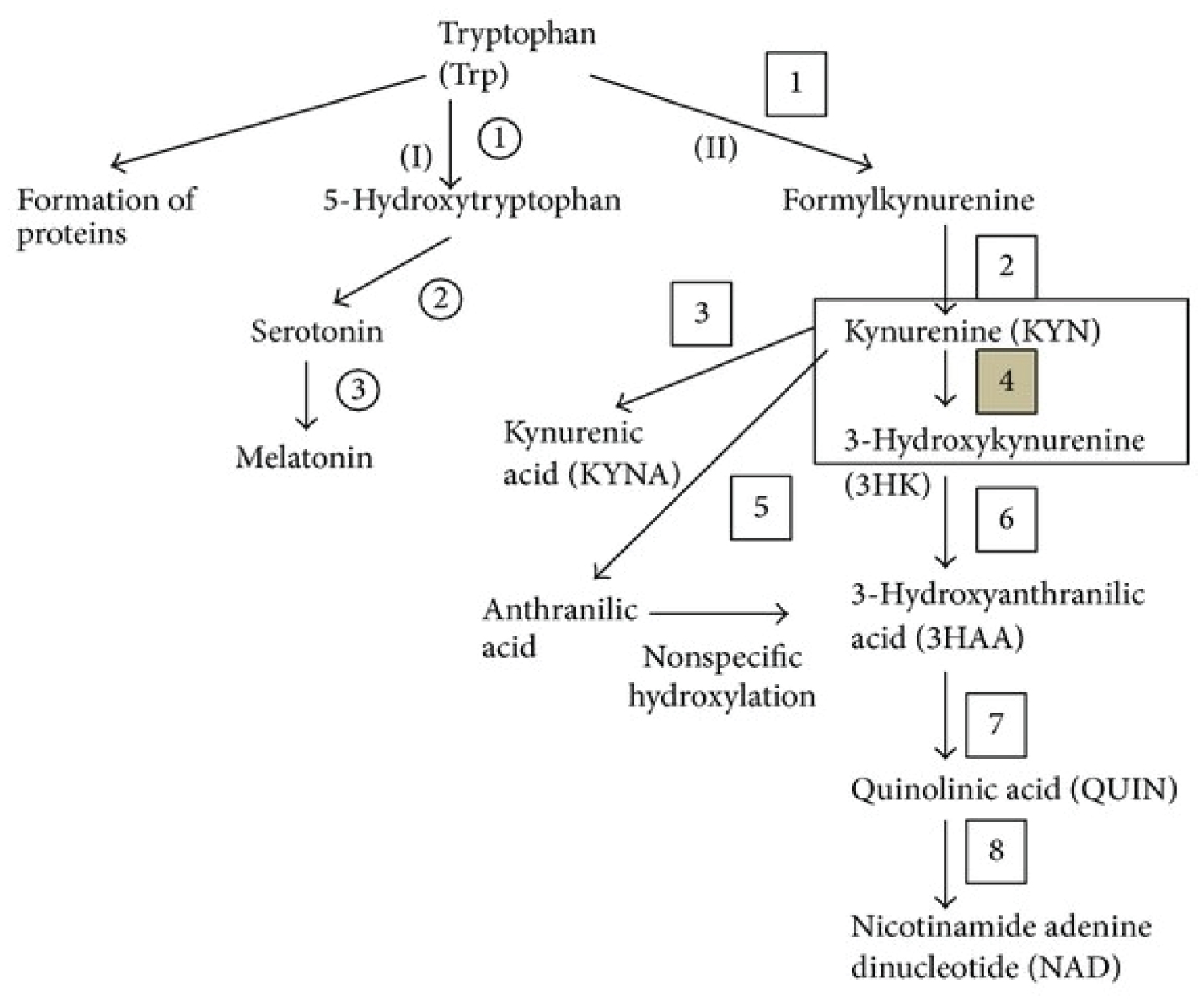 Figure 7B: Tryptophan metabolism. Kynurenine monooxygenase (KMO) (number 4) is an enzyme of the kynurenine (Kyn) pathway (KP), which is the major catabolic route of tryptophan. Kyn represents a branch point of the KP, being converted into the neurotoxin 3-hydroxykynurenine via KMO, neuroprotectant kynurenic acid, and anthranilic acid. As a result of this branch point, KMO is an attractive drug target for several neurodegenerative and/or neuroinflammatory diseases, especially Huntington's (HD), Alzheimer's (AD), and Parkinson's (PD) diseases.