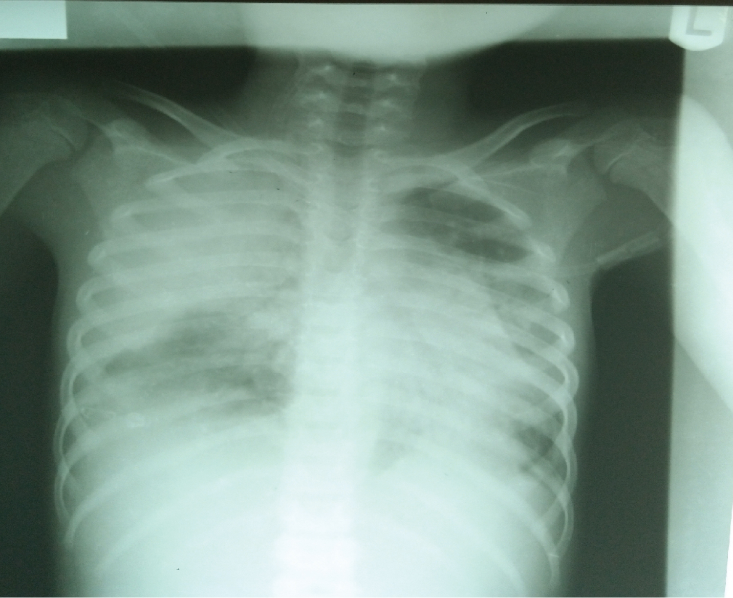 An 8-year-old girl presented to our facility with a week history of fever, 5 days' history of cough and difficulty with breathing of 4 days prior to presentation. Fever started as low grade but later became high grade and continuous. Cough was insidious in onset, and gradually worsened in frequency and intensity and persisted till presentation. It was productive of non-foul smelling, whitish coloured sputum. Difficulty in breathing started 3 days into the illness, insidious in onset and characterised by fast breathing and chest wall indrawing. No orthopnoea, paroxysmal nocturnal dyspnea, nor body swellings. This was the first episode of difficulty with breathing in her life.