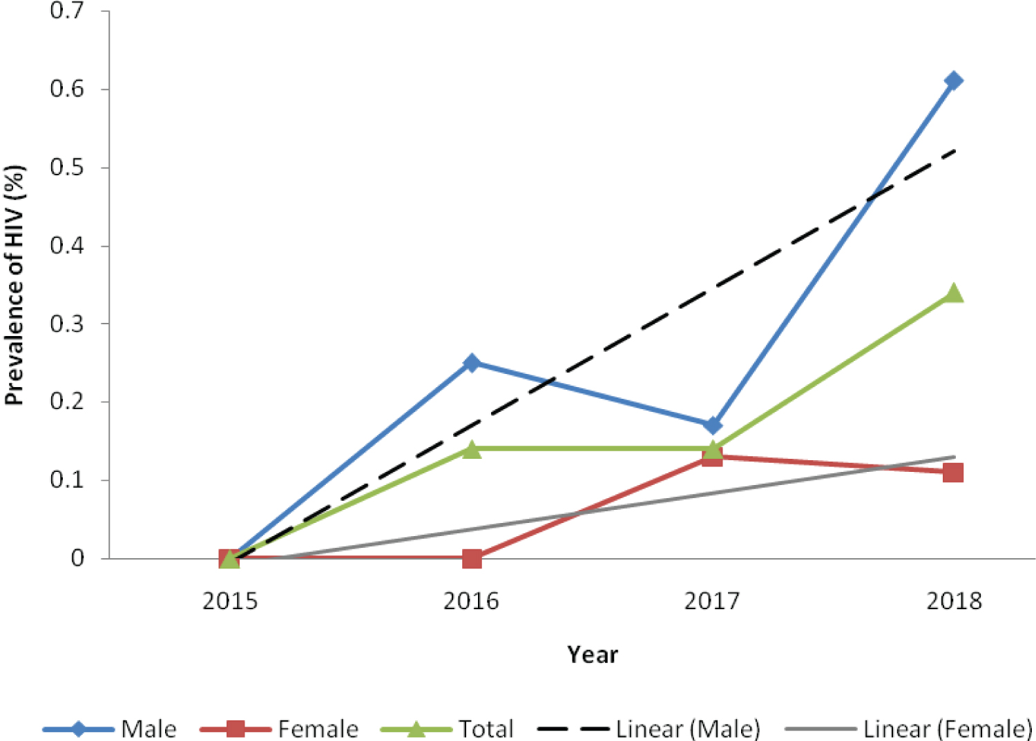 The prevalence of HIV (irrespective of sex) increased 34-folds (61-folds among males) over the course of the 4 years. The rise in the trend line for males is clearly steeper than for the females (Figure 1) and the prevalence values for the males, from 2016 to 2018 were significantly higher (P < 0.05) than those for females.