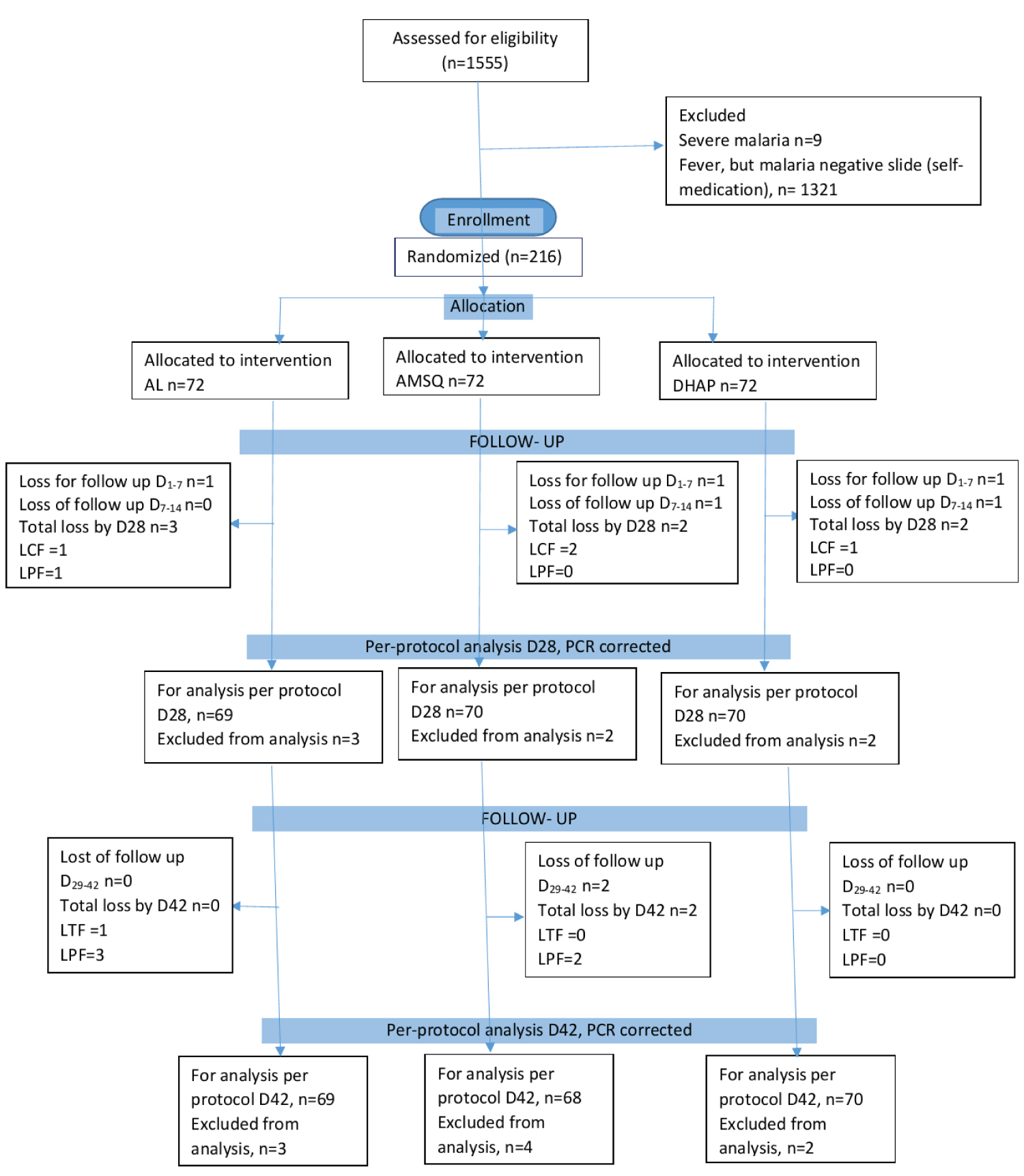 Patients were randomly assigned to receive one of three oral therapies: AL or ASMQ or DHAP on days 0, 1, and 2. AL tablets were a fixed combination, each containing 20 mg of artemether and 120 mg of lumefantrine. AL was administered according to body weight (5-14 kg: one tablet; 15-24 kg: two tablets; 25-34 kg: three tablets; > 35 kg: four tablets) as six consecutive doses: The first dose at diagnosis and the second dose eight hours later on Day 0, and then two doses at 12 hours intervals for the subsequent two days. Patients allocated to the three-day treatment with ASMQ or DHAP were given their treatment three times, at an interval of 24 hours (0 h - 24 h - 48 h). Randomization codes were computer-generated by an offsite investigator and provided to a study nurse responsible for treatment allocation. All other study personnel were blinded to the treatment assignments, and patients were not informed of their treatment regimen. The drugs were administered under medical supervision and treated patients were observed for 60 min. If vomiting occurred within 30 min of administration of the drug, the same dose was repeated. However, if it occurred 30-60 min, half the dosage was given again. Further vomiting entailed protocol violation. The patient was excluded and rescue treatment with quinine was used. Any use of concomitant medications (including acetaminophen i.e., paracetamol) were documented in the Case Report Form (CRF). Participants were also given appointment card for days 1, 2, 3, 7, 14, 21, 28, 35 and 42 for clinical examination and blood smears. Blood was taken on filter papers on each of these visits. They were also asked to return to the clinic on days other than these if they developed any additional complaints, or any change in their condition compared to pre-administration of the drug. Additional efforts were made by the field workers to locate home address of each patient for home visit in case if a patient did not report at the hospital or clinics for the scheduled visit.