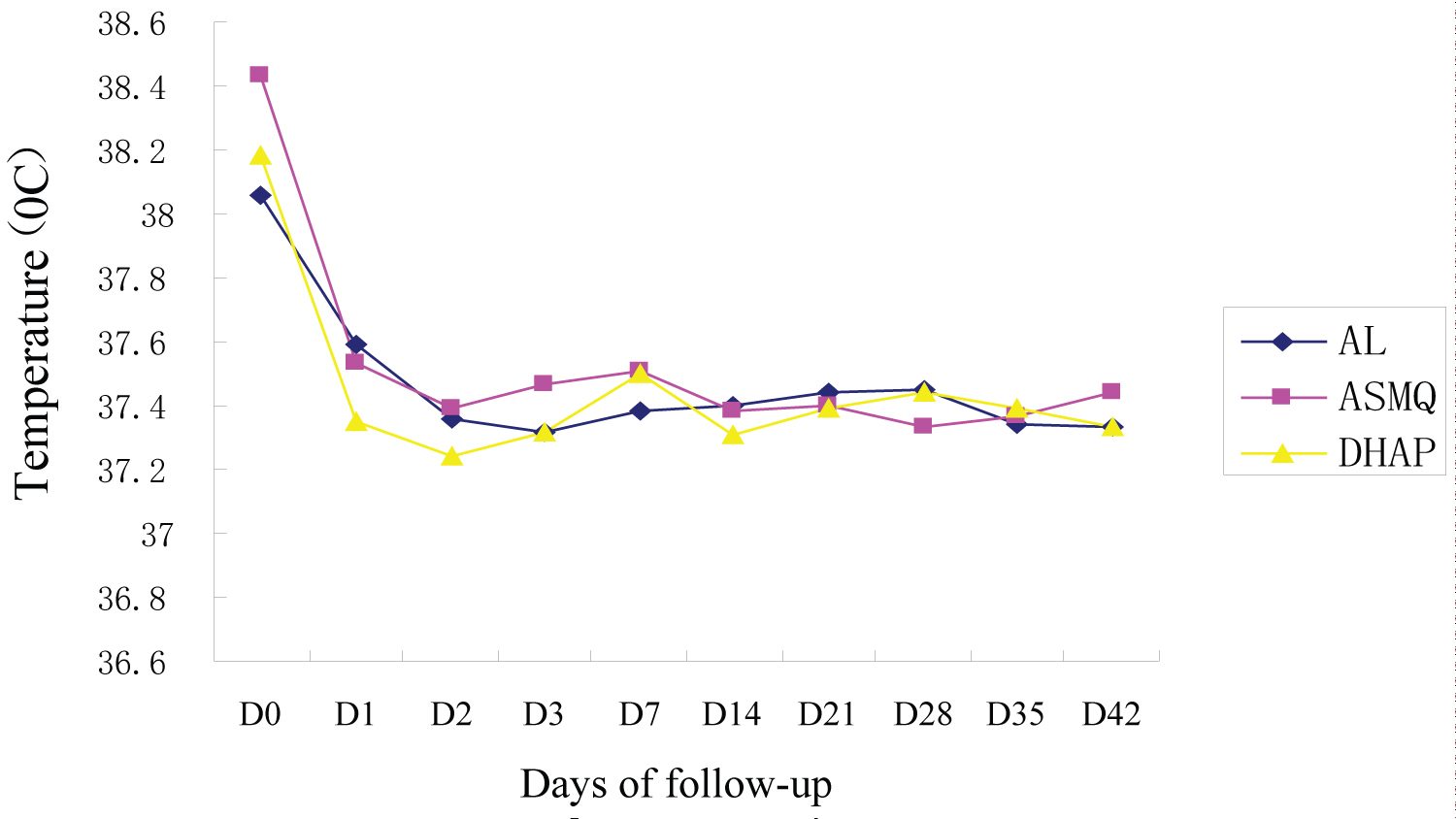 A total number of 31 patients including 10 in AL group, 13 in ASMQ group and 8 in DHAP group harboured a rectal body temperature of 40 ℃ and above with the mean temperature 40.35 ± 0.32 ℃ of in the AL treatment group; 40.05 ± 0.08 ℃ in ASMQ and 40.17 in DHAP group. Overall, there was a significant decrease of these temperature from D0 and throughout the follow period (Figure 3) without any significant difference (P > 0. 05) between the treatment groups.