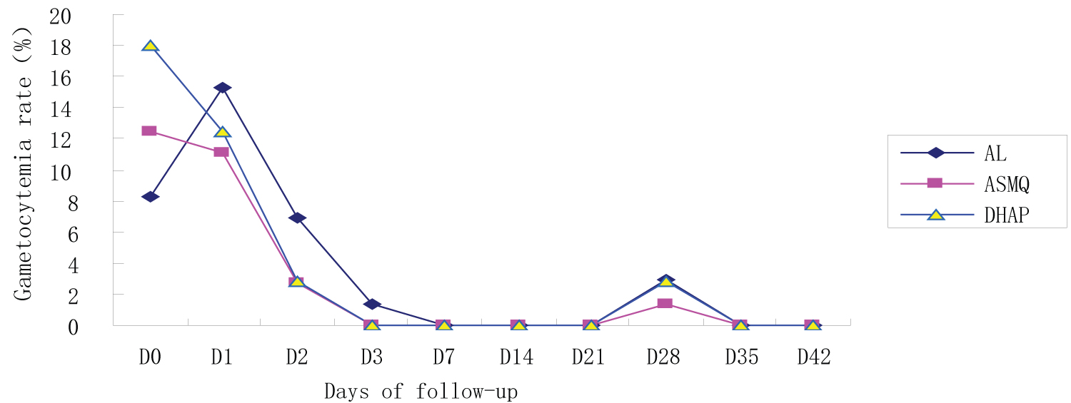 A total of 23 (10.6%) patients had gametocytemia at baseline; 6 (8.3%) were in the AL group, 9 (12.5%) were in the ASMQ group, and 8 (11.1%) were in the DHAP group. Of the 193 (89.4%) patients without gametocytemia at baseline, 5 (15.27%) in the AL group, 2 (2.7%) in the ASMQ group, and 3 (4.2%) in the DHAP group developed gametocytemia post-treatment as from D1 and throughout the weeks post-treatment (Figure 5). The proportion of cases with gametocytes increased during the first two days of treatment but overall reduced during the first week of follow-up, from 8.3% to 1.4% in the group AL, from 12.5% to 0% in the ASMQ group and from 11.1% to 1.4% in the DHAP on day 3. As for DHAP and ASMQ group, all the patients (100%) cleared their gametocytaemia by day 3. In the AL, ASMQ and DHAP groups, there was no patient with gametocytes at day 7. At day 28, 2 (2.8%) patients in the AL, 1 (1.4%) patient in the ASMQ arm and 2 (2.8%) patients in the DHAP arm showed reappearance of gametocytes in their peripheral blood and all of them cleared gametocytaemia by day 35 and 42.