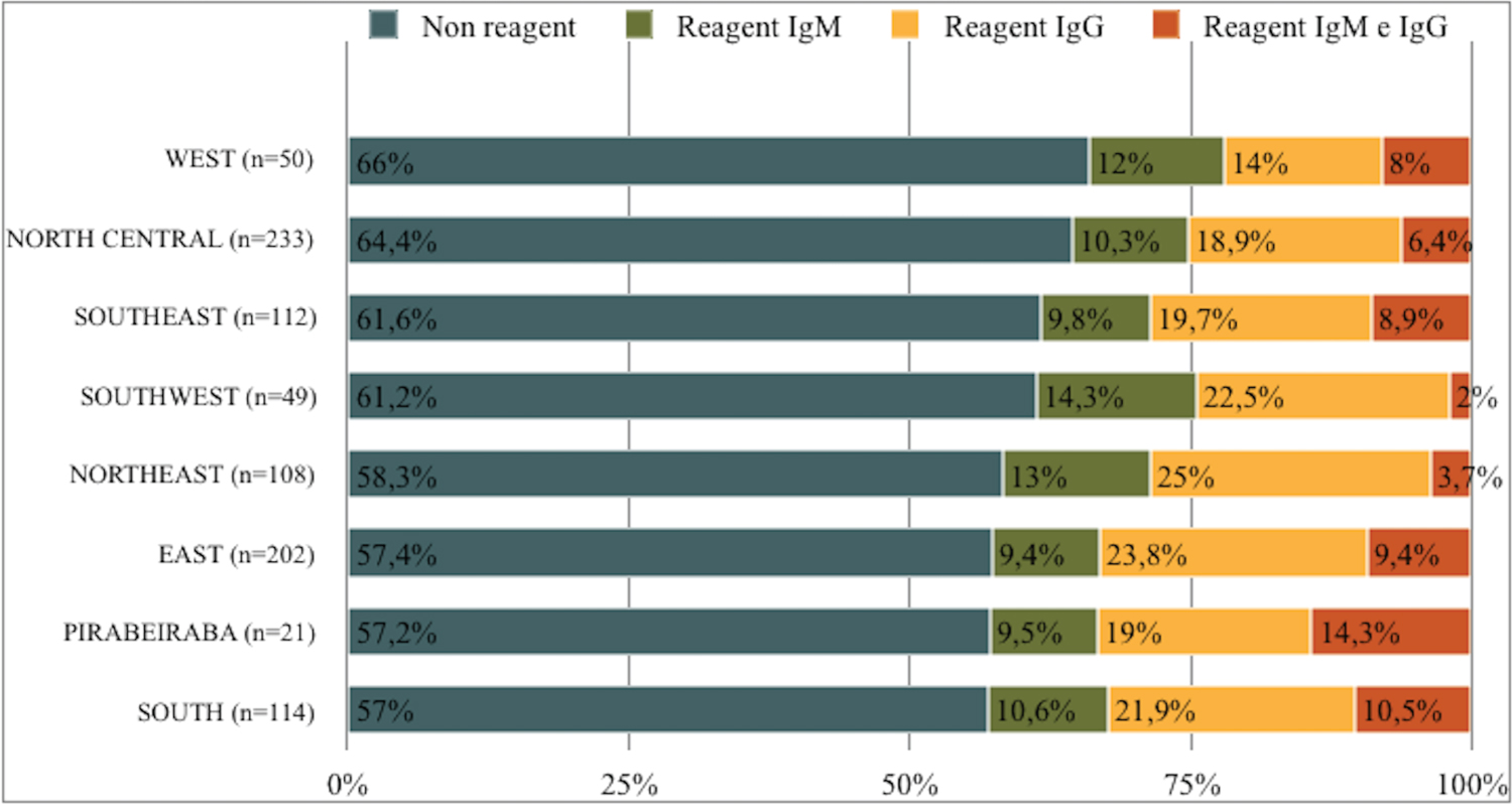 Among the participants, 889 (87.6%) of them were residents of Joinville, with the rest of the donors from other cities in the metropolitan region. The results were analyzed by region of residence in the city of Joinville, as shown in Figure 1. There was a predominance of samples reactive to any immunoglobulin in the southern region (43%), followed by the district of Pirabeiraba (42.8%). The regions with the least positive results for antibodies were the West (34%) and North Center (35.6%) regions. Regarding IgM, there were a greater number of reagents in the Southwest (14.3%). Analyzing the IgG, the highest positive result occurred in the Northeast region (25%). Meanwhile, the highest concomitant positivity of IgG and IgM immunoglobulins occurred in Pirabeiraba (14.3%).