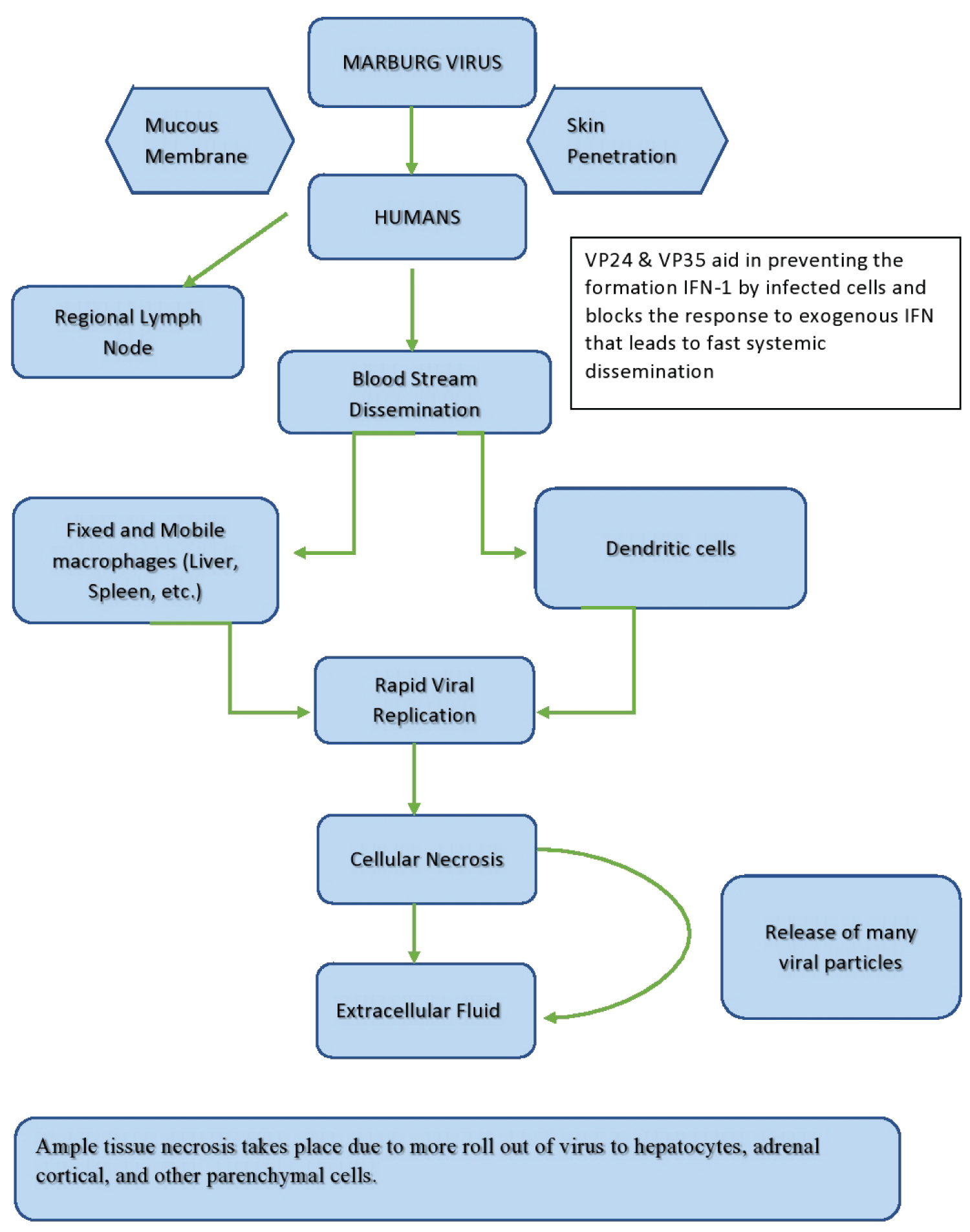 The pathogenesis of MVD illustrated in Figure 2 is similar to that of the Ebola virus and its clinical presentation is similar to tropical diseases like typhoid fever, malaria, or hemorrhagic fever of viral origin. The incubation period of MVD ranges from two to twenty-one days with typical symptoms including hyperthermia, shivering, headache, and muscle aches. Within a week of the onset of these features, a maculopapular rash can appear, more visibly on the torso. Pain in the abdomen, chest, and throat with giddiness, emesis, and loose stools may also be present. Disease severity increases suddenly from a rapidly progressing febrile illness, which later develops into multiorgan failure, exhaustion, and shock can increase causing signs of multiple organ damage [6,7].