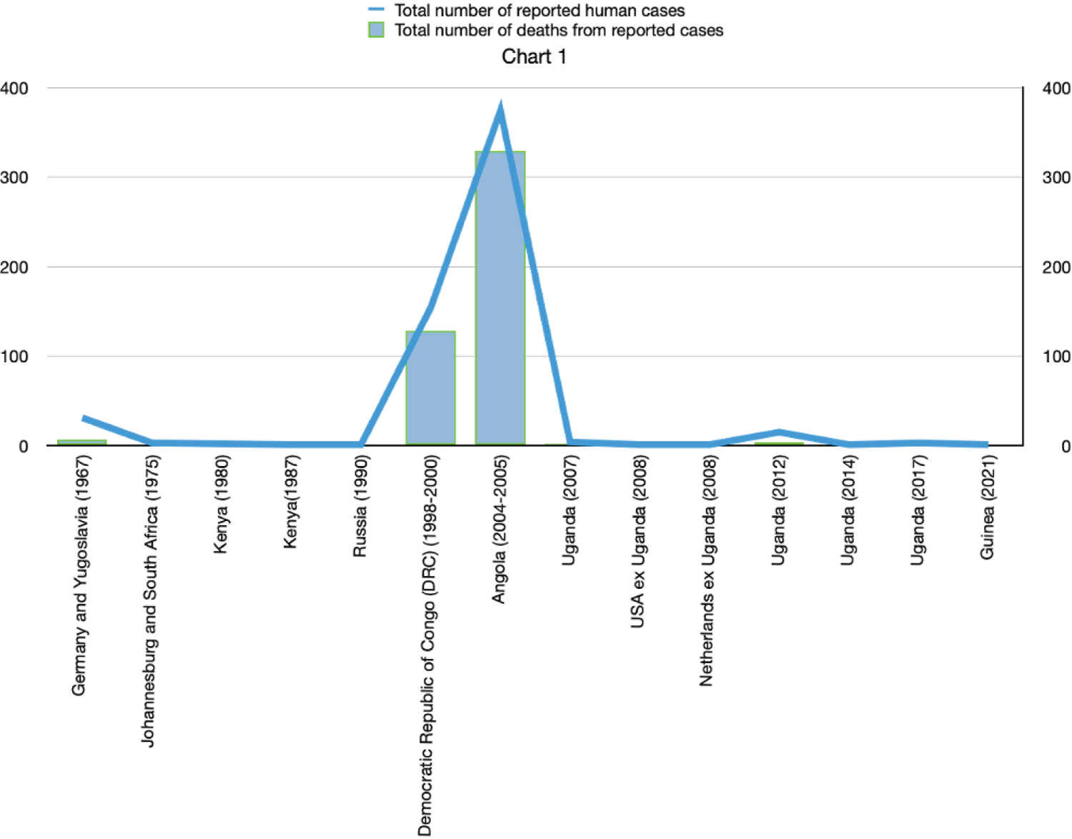 Since the discovery of the Marburg virus in 1967 there have been 13 outbreaks with 10 occurring in Africa, including the recent 2021 Outbreak, outlined in Table 1 and Figure 3 [10].