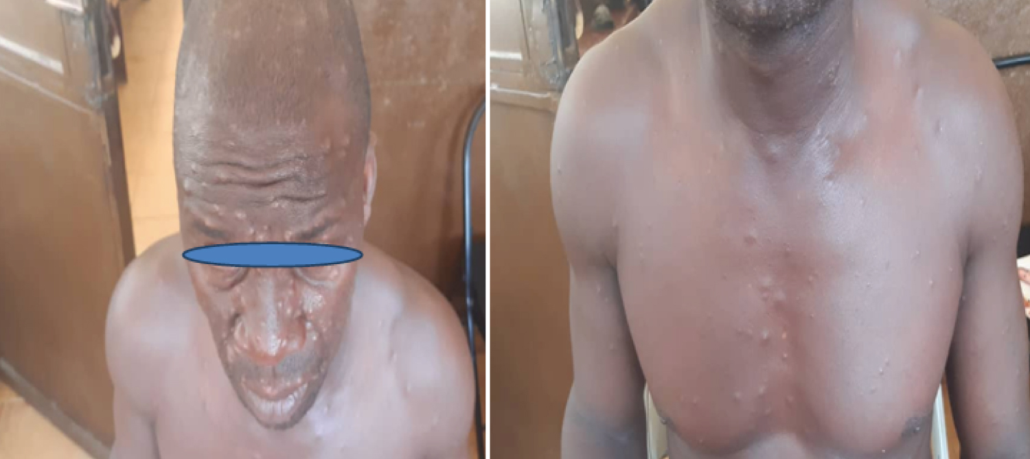 The case-patient was a middle age and lived in Sengbeh Chiefdom, Koinadugu District. On March 3, 2021, he developed fever and was treated with traditional medications at home for four days. Because there was no improvement, the patient reported to the Koinadugu 2 Community Health Centre on March 6, 2021. The health care worker performed a rapid diagnostic test for malaria which was positive and provided antimalarial drugs. After three days, the case-patient's fever did not subside and he developed firm pustules that started on his face and spread to other parts of the body, headache, generalized body weakness, and itchy skin.