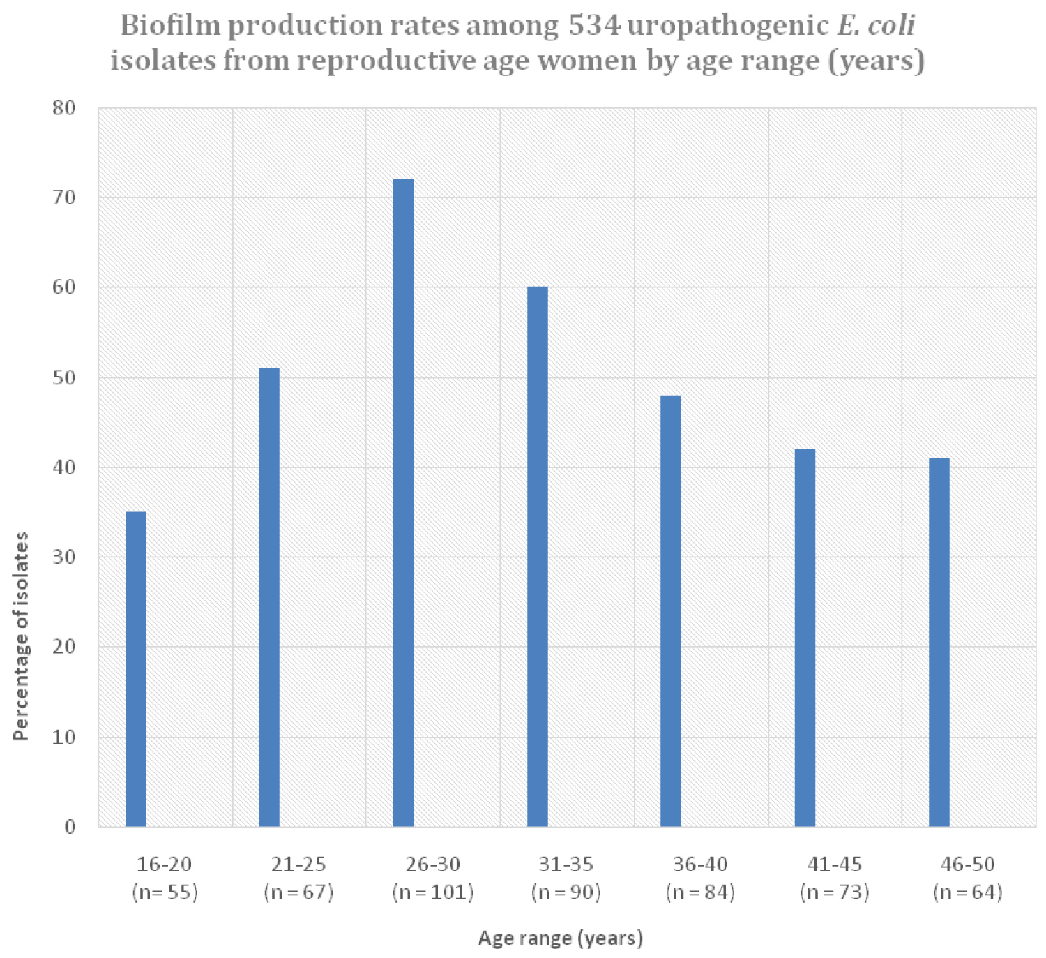 Figure 1: Biofilm production rates amongst 534 uropathogenic E. coli isolates from reproductive-age women by age range (years).