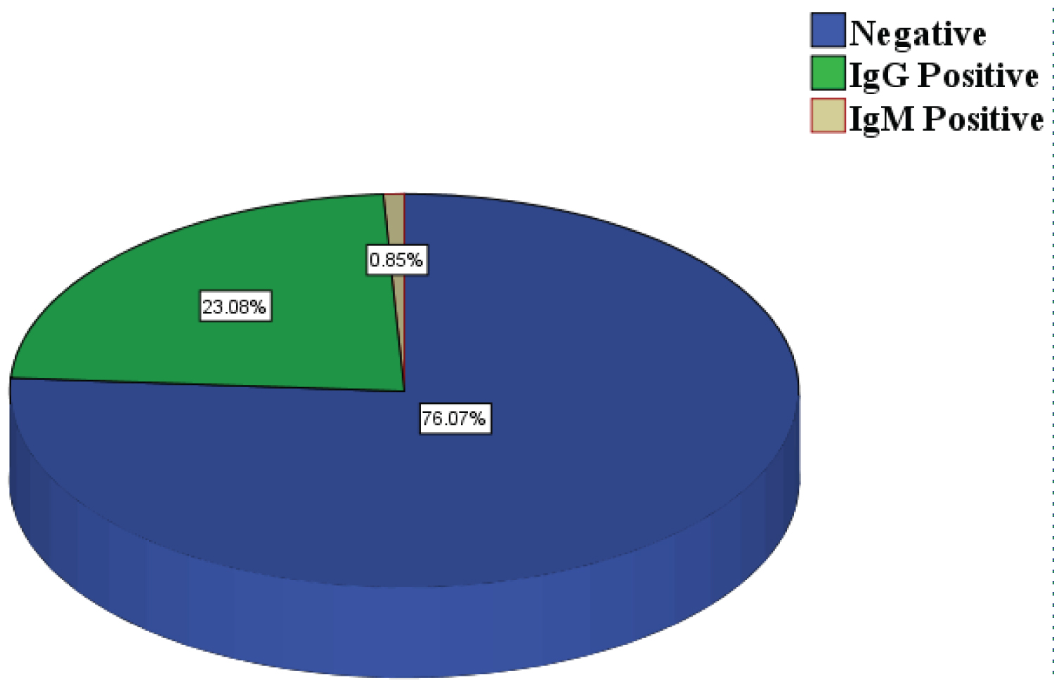 Figure 1 shows the overall seroprevalence of IgG and IgM toxoplasmosis. It follows from the analysis of this figure that 23.9% of pregnant women were positive for toxoplasmosis with 1 (0.85%) positive for IgM, 27 (23.08%) positive for IgG.