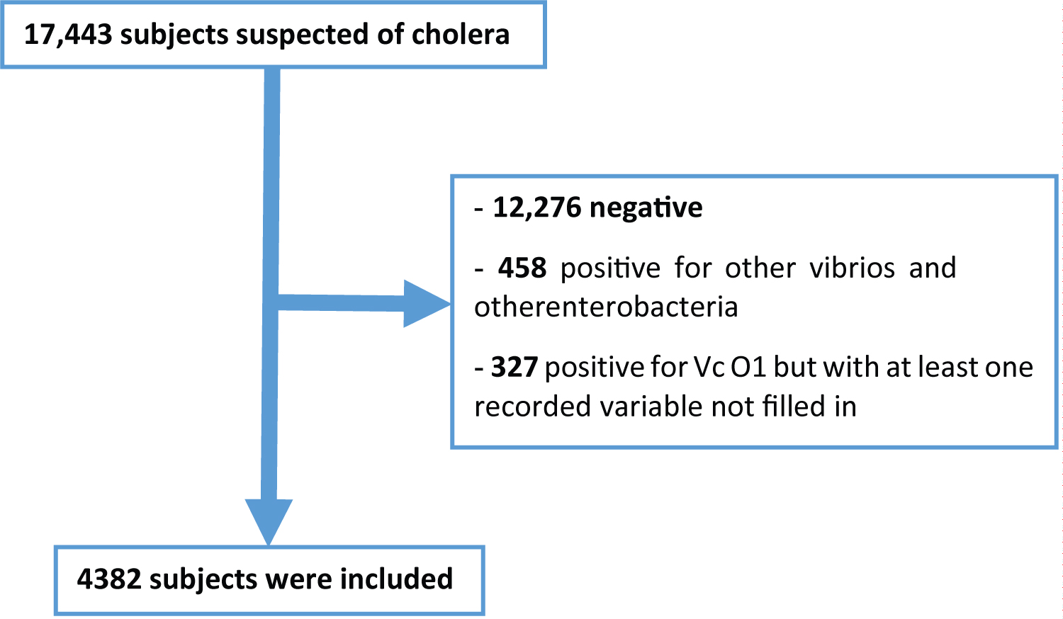 Over a period of 11 years and 6 months, from January 1, 2011 to June 30, 2022, we collected 4709 isolates of Vibrio cholerae O1 out of a total of 17443 stool samples from suspected cholera subjects from six provinces located in the Eastern DRC: North Kivu, South Kivu, Maniema, Tanganyika, Lomami and Kasaï Oriental, then analyzed at the AMI LABO laboratory, i.e. a prevalence of 26.99%. Only 4382 isolates were retained for this study. The flow diagram illustrates the selection process according to the inclusion and non-inclusion criteria previously defined (Figure 1).