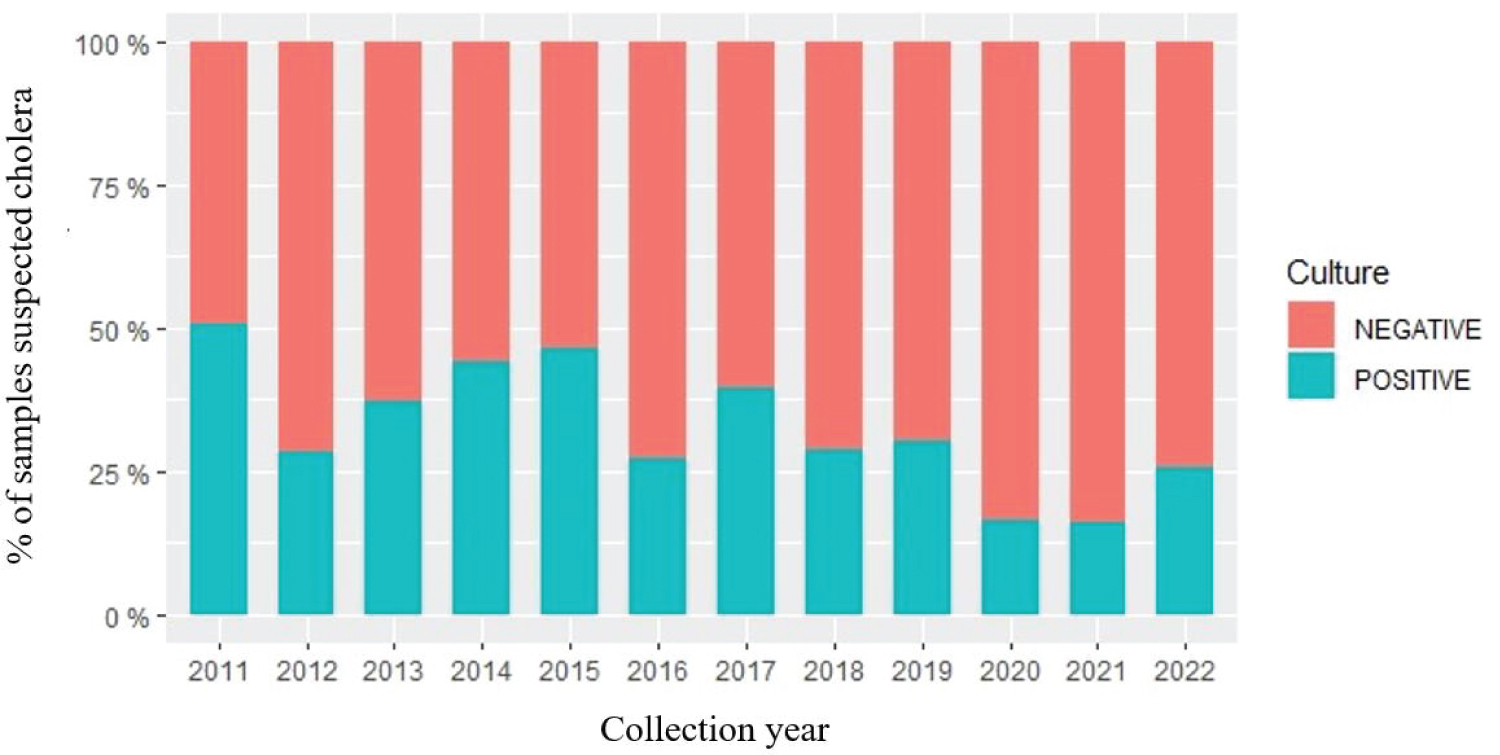 Figure 2: Distribution by year of cholera cases collected in eastern DRC and recorded at the North Kivu provincial public health laboratory AMI LABO from January 1, 2011 to June 30, 2022 (n = 4382).