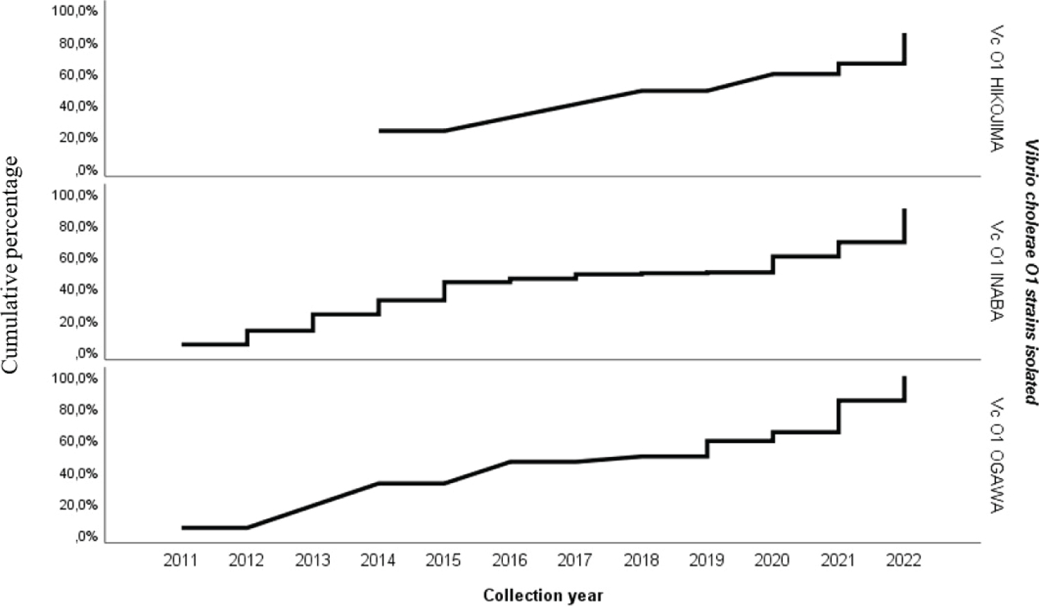 Figure 4: Isolation trend of the 3 strains of Vibrio cholerae O1 over time, during cholera epidemics in eastern DRC from January 1, 2011 to June 30, 2022 (n = 4382).