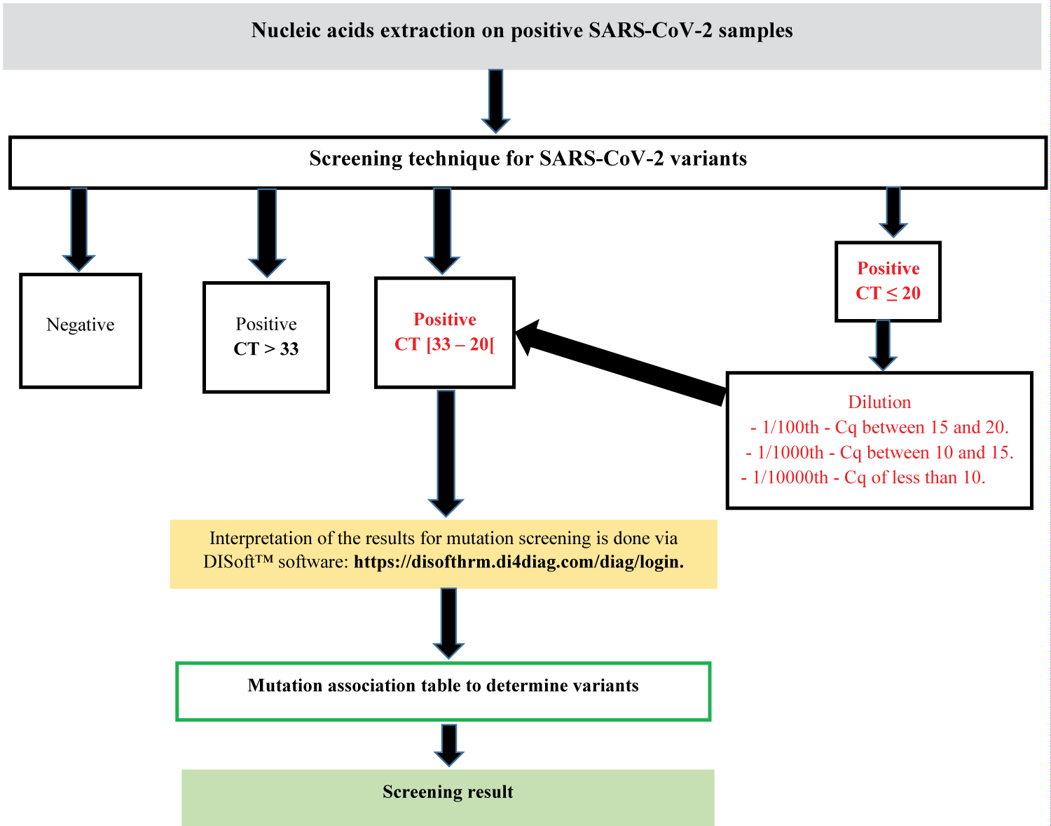 Samples that are positive during routine PCR diagnosis are subjected to the screening test. Positive samples with a Ct of 33 or less will be subjected to interpretation of the results. Interpretation of results for mutation screening is done via DISoft™ software, available at: https://disofthrm.di4diag.com/diag/login.