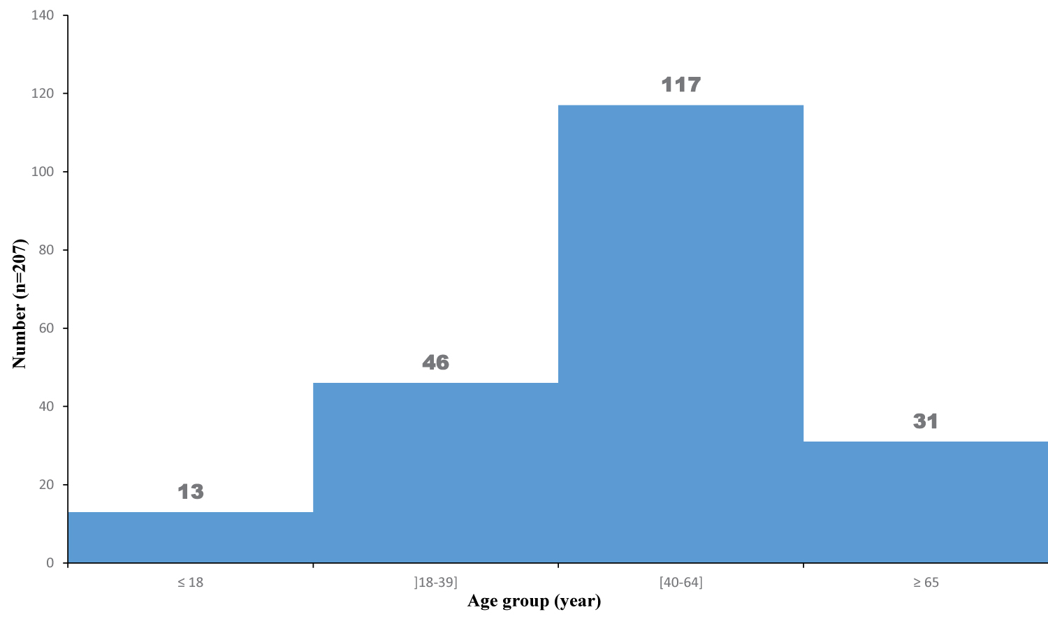 Out of the 207 participants included in this study, 106 (51.21%) were males. Among the participants infected with SARS-CoV-2 non-Omicron variant, 60% were male. The difference was not statistically significant (p = 0.510) (Table 1). The age of the participants ranged from 2 month to 83 years with a median age of 46.38 years +/- 17.72 years-old. We also found a mean age of 44 ± 15.2 years for SARS-CoV-2 non-Omicron variant patients. The difference was not statistically significant (p = 0.613) (Table 1). The most represented age group was 40-64 years representing 61.39% (97 ÷ 158) participants (Figure 3).