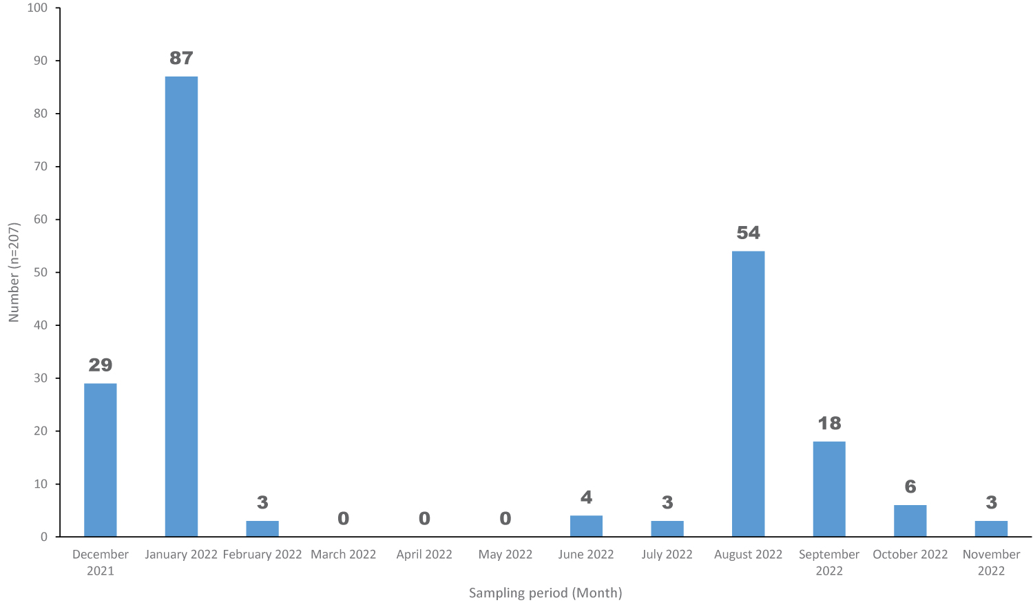 In our study, Omicron was not detected in November 2021. Its first detection was in December 2021. The highest number of Omicron was observed in January 2022 corresponding to 42.03% (87/207) of the total cases. From March until May no SARS-CoV-2 variant was detected. We observed cases in June but it was in August that the second wave really took off with a rate of 26.009% (54/207). This study revealed two waves of the SARS-CoV-2 Omicron variant in January and August 2022 after its introduction in Burkina Faso (Figure 4).