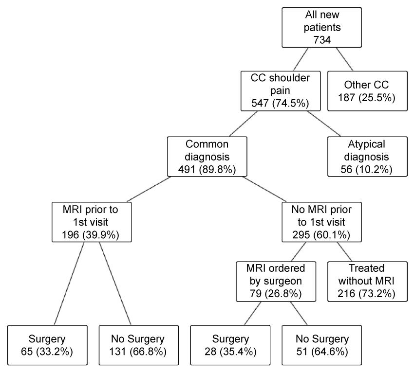 A retrospective study was conducted of all new patient visits to an orthopedic surgery shoulder and elbow specialty practice for the 12-month period beginning in July 2012 and ending in June 2013. Patients were identified by searching the Cerner Powerchart scheduling system, and all patients presenting with a chief complaint of shoulder pain and 18 years of age or older were included in the study. Patient medical records were examined and the following information was recorded: sex, age at the time of the new patient visit; MRI studies and their findings done within 6 months prior or 12 months following the new patient visit; physical therapy or injections received for treatment of shoulder pain in the 12 months prior to the new patient visit; and any shoulders surgery within 12 months following the new patient visit. The study was granted approval by the Institutional Ethics Review Board.