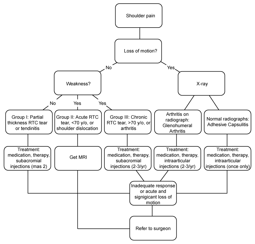 Figure 2: Suggested protocol for evaluation and treatment of shoulder pain. Loss of motion refers to passive range of motion.