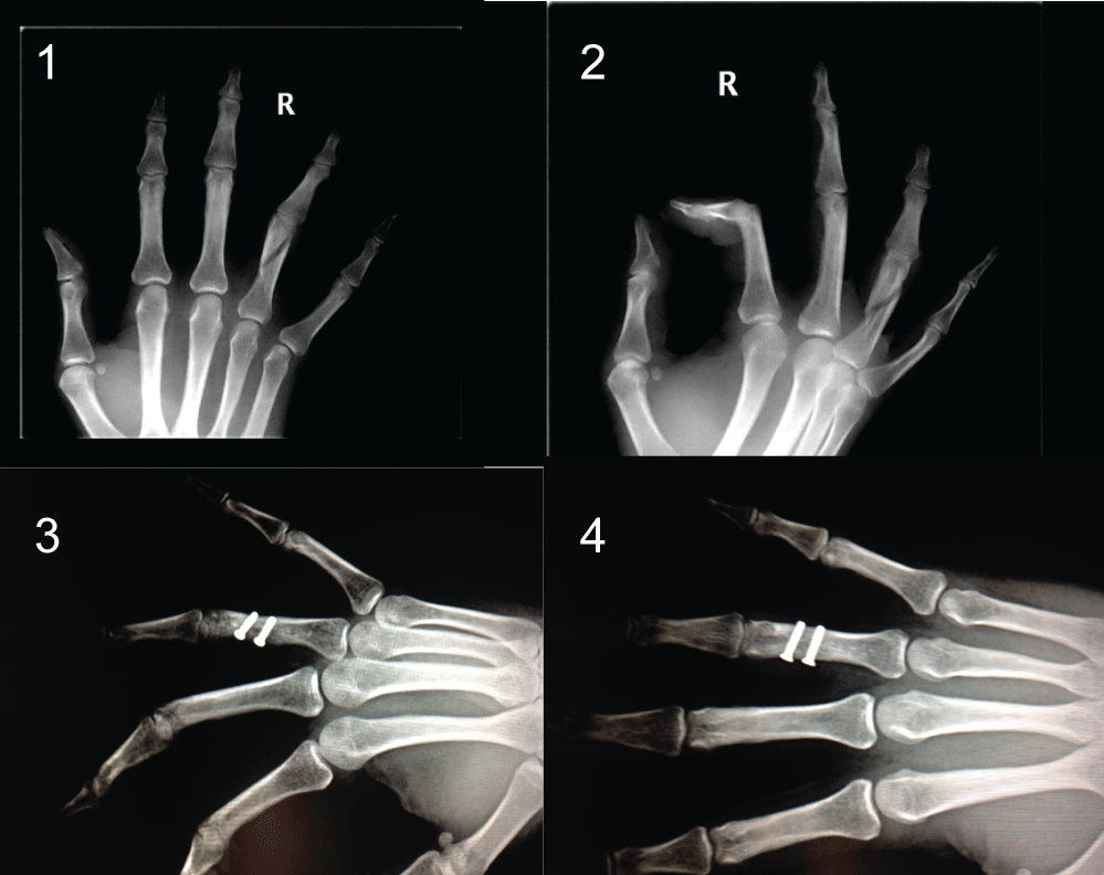 Figure 3: Spiral fracture of the middle phalanx (3rd finger) treated using 2 screws. View Figure 3