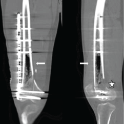 Figure 2: Last CT in coronal (left image) and sagittal (right image) planes with bone windowing, at the same level than Figure 1. A wide presence of air into the medullary canal of the right femoral diaphysis can be depicted (arrows). A posterior cortical defect is shown (next to the star).