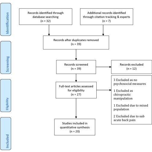 In total 39 studies were identified, after screening titles and abstracts 27 remained. Three papers were excluded on reading the full text as there were no measures of psychosocial factors (three studies), one as the intervention was chiropractic and outside traditional physiotherapy practice, another paper [32] was excluded as it included both neck and back patients in one homogenous group with no separate analysis of back pain patients, and another had a definition which allowed for sub acute low back pain patients to be included [33]. The remaining 20 papers met the inclusion criteria. One foreign language paper met the inclusion and included [34], this paper was translated using google translate so that it could be included in the analysis. A clear limitation is that these studies look at groups of CLBP patients that show yellow flags on average, but within each cohort there will have likely been patients with very few yellow flags and possibly some with very significant yellow flags. Using the guidelines of the Cochrane Back Review Group [31] the studies were classified as high or low risk.
