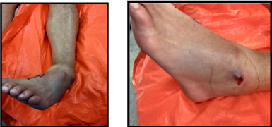 Figure 1: Lateral dislocation of talus; foot in equinus and supination, puncture wound on the skin.