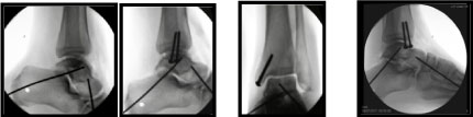 A K-wire each was inserted through the talo-calcaneal and talo-navicular joints under fluoroscopy to ensure stability. The medial malleolar fracture was stabilised with 2 partially threaded cancellous screws (Figure 7).