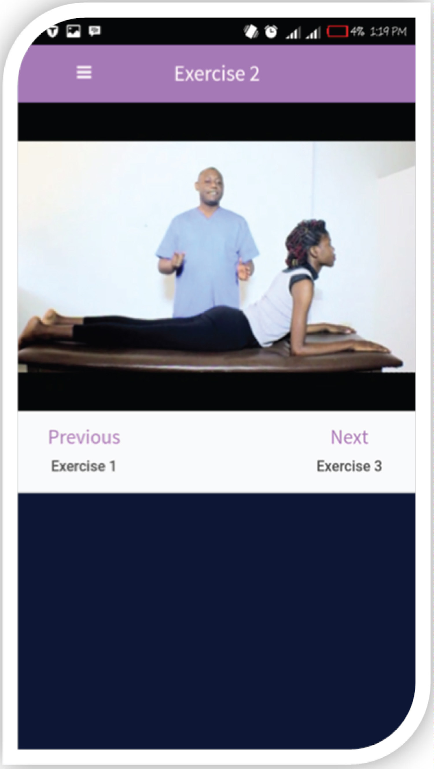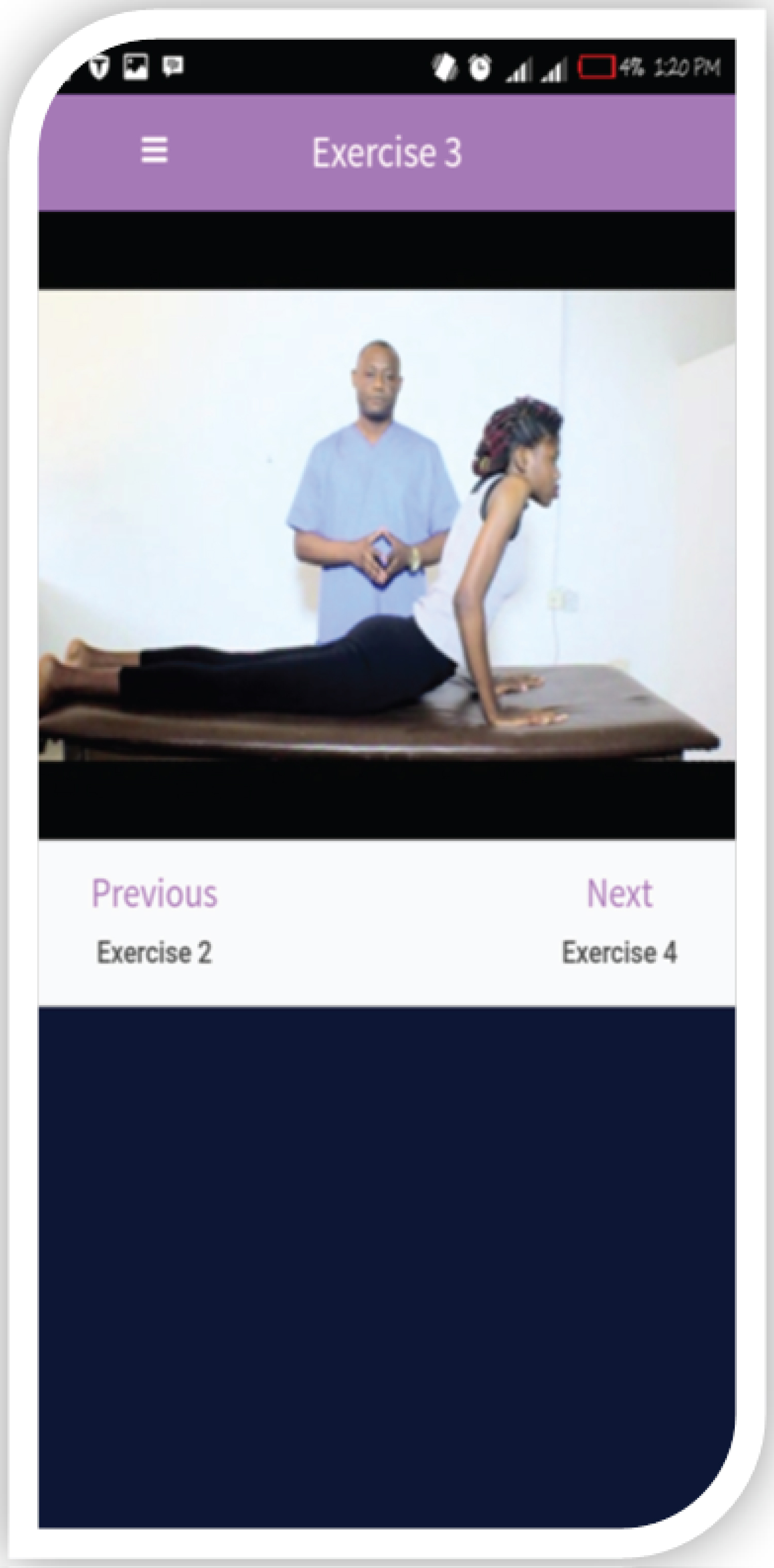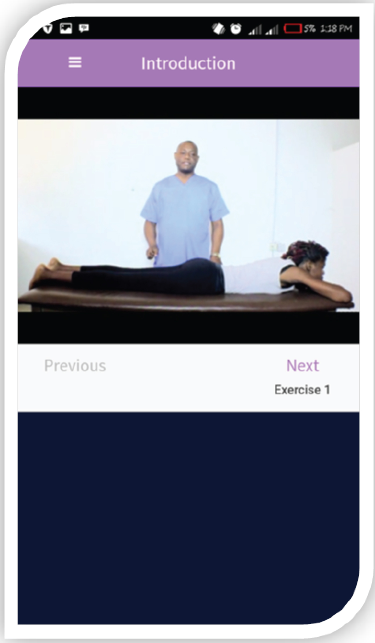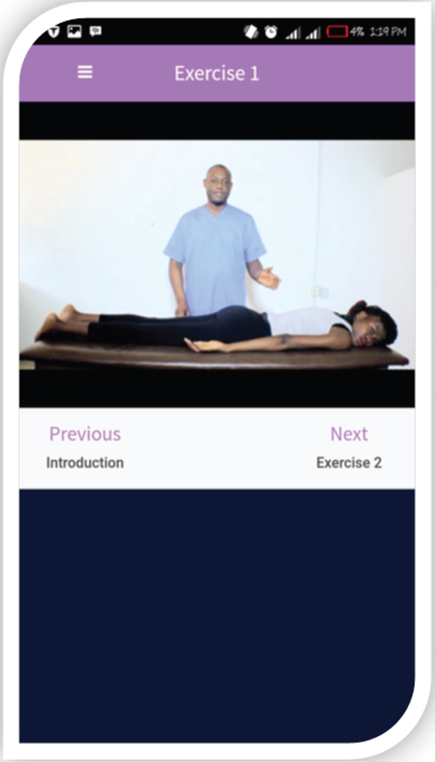The development of the app involved professional video recording using HC-V770 Panasonic camera with high Lens system that gave High Dynamic Range (HRD) video capture of the various exercises. The consenting models for the development of the app include a physiotherapist who volunteered as instructor, an athlete who modeled as patient, and some undergraduate physiotherapy students who volunteered for photo shots for the mobile app podcasts. Audacity audio editing software was used in the audio recording and editing of the app. The background noise was eliminated and audio tracks were perfectly edited to give a quality output that was exported with the video. The developed App can be viewed through this link: