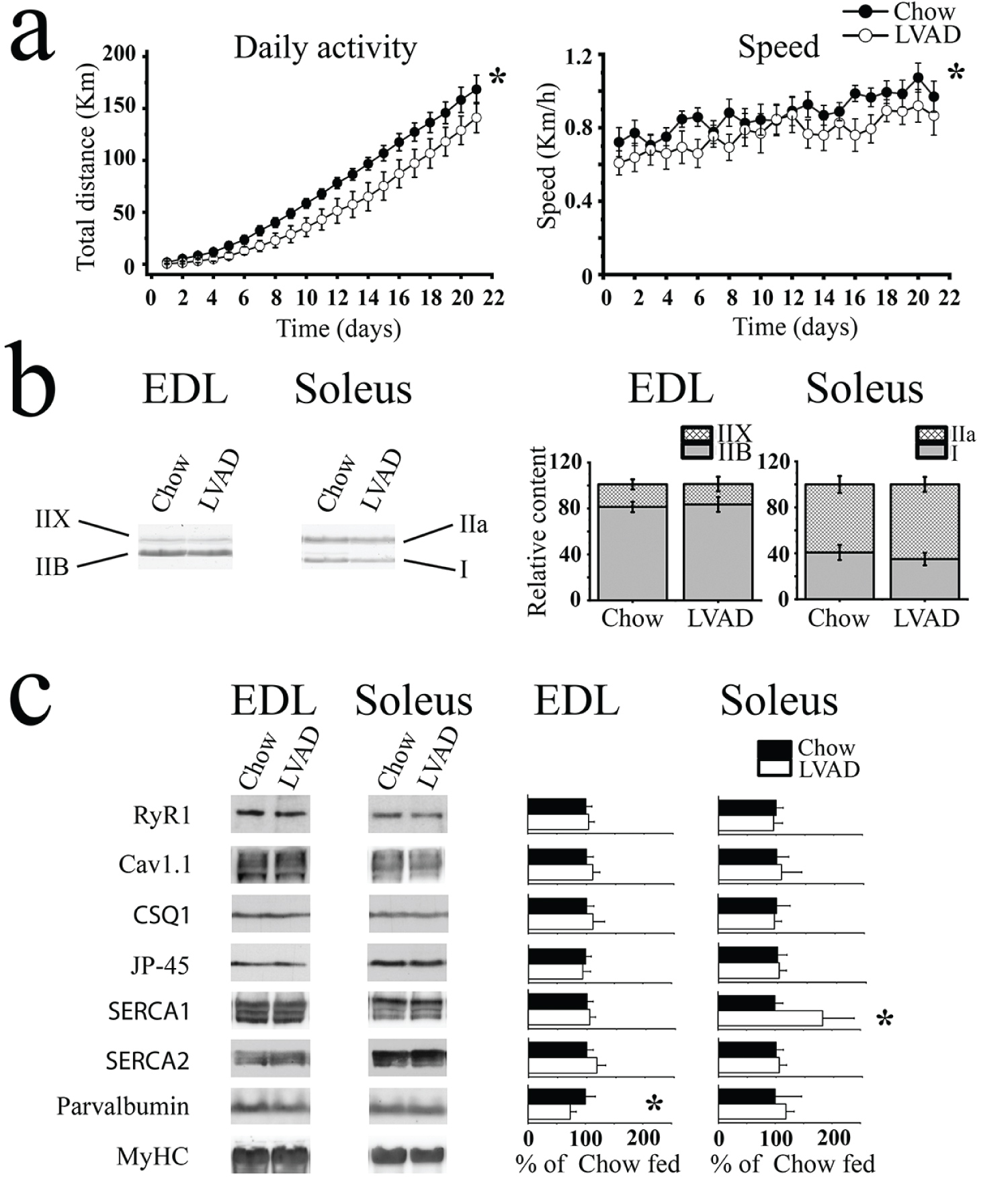 Figure 1: Spontaneous activity is decreased in LVAD fed mice but this is not caused by altered content of RyR1 and Cav1.1. (a) Spontaneous daily activity (left) and mean running speed (right) of chow few (black symbols; n = 16) LVAD fed mice (empty symbols; n = 16) mice. Each point represents the mean (± S.D.) distance run over a period of three weeks *p < 0.05 ANOVA; (b) Representative Coomassie blue stained high-resolution gel showing that there are no differences in MyHC isoform content between chow and LVAD fed mice. The histograms on the right show the mean (± S.D., n = 5) relative expression of each MyHC isoform relative to the MyHC total content; (c) Western blot analysis of total muscle homogenates. Left panels, representative immunopositive bands. Right panel, bar graphs showing mean (± S.D., n = 4-6) relative intensity of the immunoreactive band in muscle homogenates from LVAD fed mice. Homogenates were prepared from 4-6 chow fed and 4-6 LVAD fed mice. The mean intensity of the immunopositive band in chow fed mice was set to 100%. Proteins were separated on 6% (RyR1, Cav1.1), 10% (SERCA1, SERCA2, JP-45, CSQ1) or Tris-Tricine gels (parvalbumin) SDS-PAGE.*p < 0.05 Student's t test.