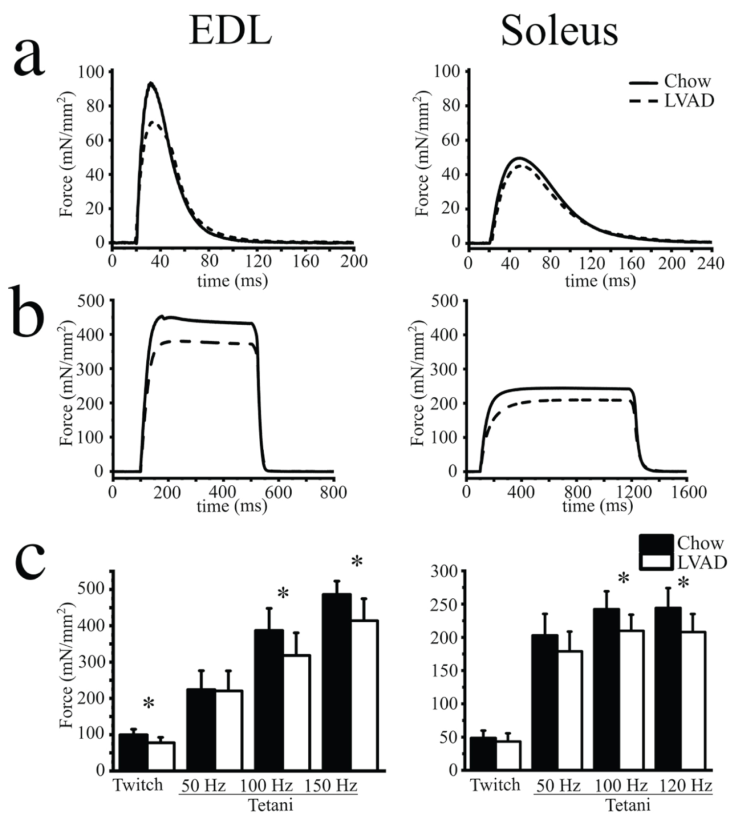 Figure 2: Mechanical properties of isolated EDL and soleus muscles from chow and LVAD fed mice. Representative traces showing force developed by EDL (left) and soleus (right) muscles isolated from chow fed (continuous trace) and LVAD fed (dashed trace) mice. (a) Twitch force was stimulated by a 15 V pulse of 1.0 ms duration; (b) Maximal tetanic force was induced by a train of pulses delivered at 150 and 120 Hz for EDL and soleus, respectively; (c) Mean (± S.D.) specific force (mN/mm2) developed after twitch and tetanic stimulation at the indicated frequencies. Experiments were performed on muscles isolated from n = 7 chow fed and n = 9 LVAD fed mice. * p < 0.05 Mann-Whitney test.