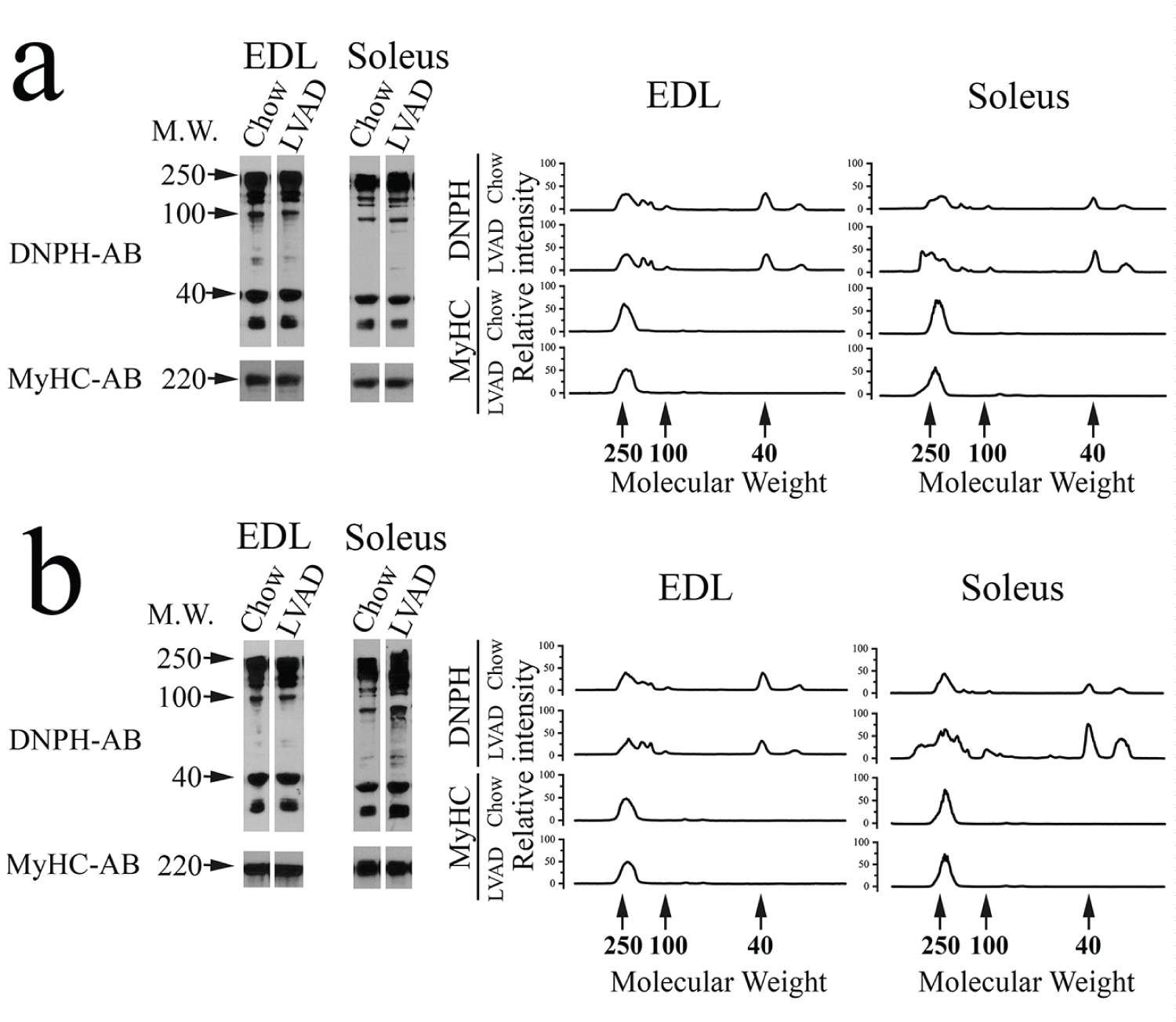 Vitamin A together with vitamin C and vitamin E have anti-oxidant activity and enhanced oxidative stress has been postulated as being responsible for aging, disease as well as decreased muscle function [15-17]. Since in vivo and ex vivo muscle function is negatively impacted by the LVAD, we investigated whether this is paralleled by enhanced skeletal muscle protein oxidation. Oxidized proteins can be visualized by immunoblotting using the Oxyblot detection system, which derivatives carbonyl groups formed during protein oxidation, to protein hydrazones by incubating them with 2,4-dinitro-phenylhydrazine (DNPH) [18]. Muscles of sedentary mice were isolated, total homogenates were prepared, proteins were derivatized with DNPH and immediately flash frozen in liquid nitrogen. Subsequently, oxidation of proteins was evaluated by western blotting using anti-DNPH antibodies. Figure 4a shows representative Oxyblots (left panels) and densitometric scans (right panels) of the immunopositive bands present in total homogenates from EDL and soleus muscles isolated from chow and LVAD fed sedentary mice. The lower panels show MyHC loading controls. Both EDL and soleus muscles from chow and LVAD fed mice contain a number of oxidized proteins having a wide range of molecular weights. There was no difference in the proportion of oxidized proteins between the chow and LVAD mice (Figure 4a). The high molecular weight oxidized protein present in the total homogenates likely corresponds to MyHC isoforms and their modification would impact force generation. To this aim we separated the MyHC isoforms by running high resolution acrylamide gels [13], blotted them onto nitrocellulose and probed the membranes with anti-DNPH antibodies; after visualization of the immunopositive bands the blots were stripped and re-probed with an anti-MyHC antibody recognizing all isoforms. There was no difference in the level of oxidation of MyHC II b (EDL) or MyHCI and IIa (soleus) between chow and LVAD fed mice (Supplementary Figure S3a).