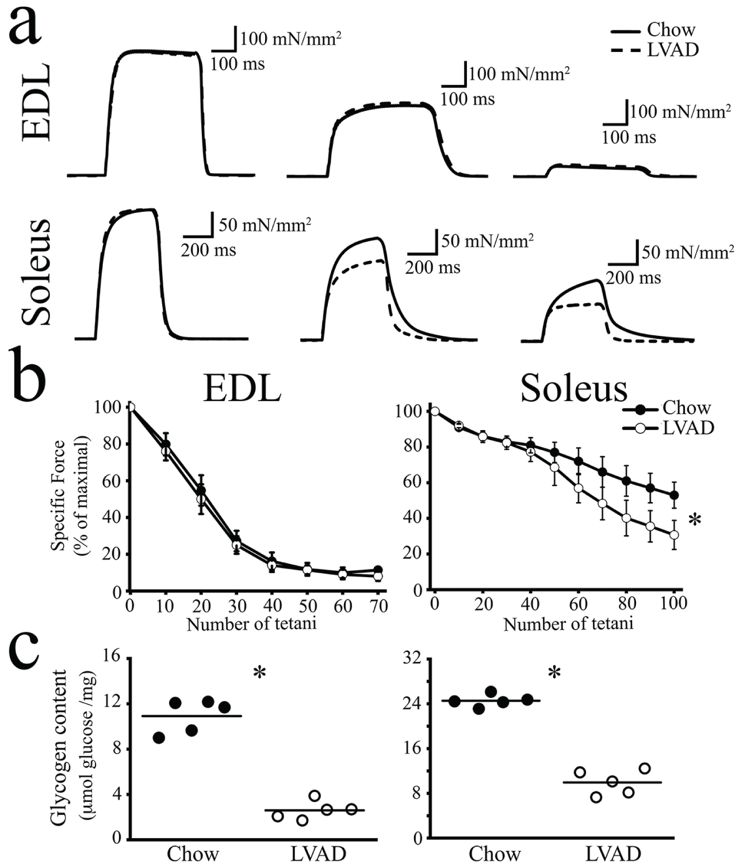 Figure 5: Soleus muscles from LVAD fed mice fatigue earlier and have smaller glycogen stores compared to muscles isolated from chow fed mice. (a) Representative traces of electrically evoked force developed by isolated EDL and soleus muscles with a train of tetani (150 Hz, 300 ms, for 5 min and 120 Hz, 300 ms during 8 min for EDL and soleus, respectively) delivered at 0.27 Hz. Continuous line, chow fed mice; dashed line, LVAD fed mice. Traces represent force developed after the 1st, 20th and 70th tetanic stimulation in EDLs and 1st, 60th and 100th tetanic stimulation in soleus; (b) Normalized mean force versus number of tetani in EDL and soleus muscles. EDLs from chow and LVAD fed mice showed similar fatigue sensitivity whereas soleus muscles from LVAD fed mice were more susceptible to fatigue. Each point represents the mean ± S.D.; n = 5 chow fed and 5 LVAD fed mice; *p < 0.05 Mann-Whitney; (c) Glycogen content was assessed enzymatically in total homogenates from EDL and soleus muscles. Each symbol represents the mean value of both muscles of a single mouse; the median value is represented by the horizontal black line. *p < 0.05 Mann Whitney test.