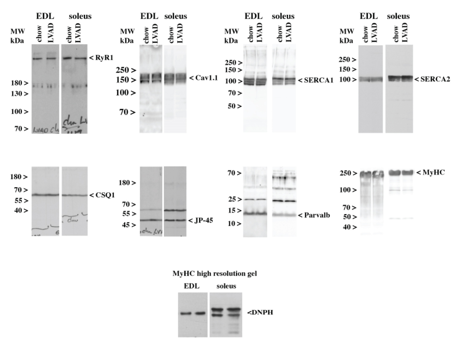 Supplementary Figure 1: Immunoreactivity of antibodies used on western blots. 30 μg proteins in total homogenates of EDL and soleus from chow and LVAD fed mice were separated on 6% (RyR1), 7.5%, 10% or Tris tricine SDS-PAG, blotted onto nitrocellulose and probed with the indicated primary antibodies. Blots were then incubated with peroxidase conjugated anti mouse IgG or peroxidase conjugated protein-G and the bands were visualized by chemiluminescence.