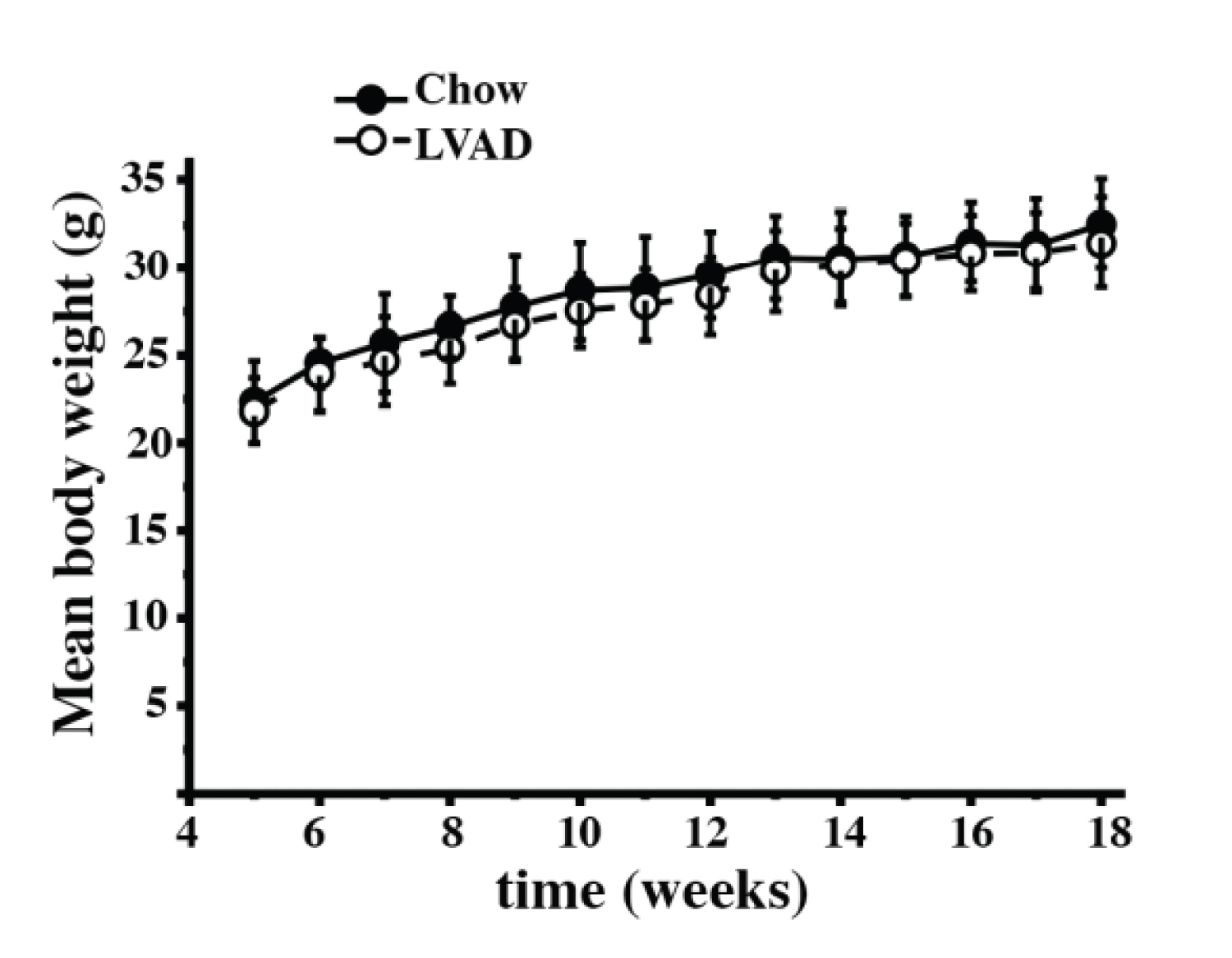 Supplementary Figure 2: Growth curves of Chow and LVAD fed mice. Male mice were weighed once a week starting from week 5 of age. No difference in weight between Chow fed (closed circles) and LVAD fed (empty circles) was observed. Each symbol represents the mean (± S.D.) weight in grams of n = 8 (Chow fed) and n = 9 (LVAD) fed mice.
