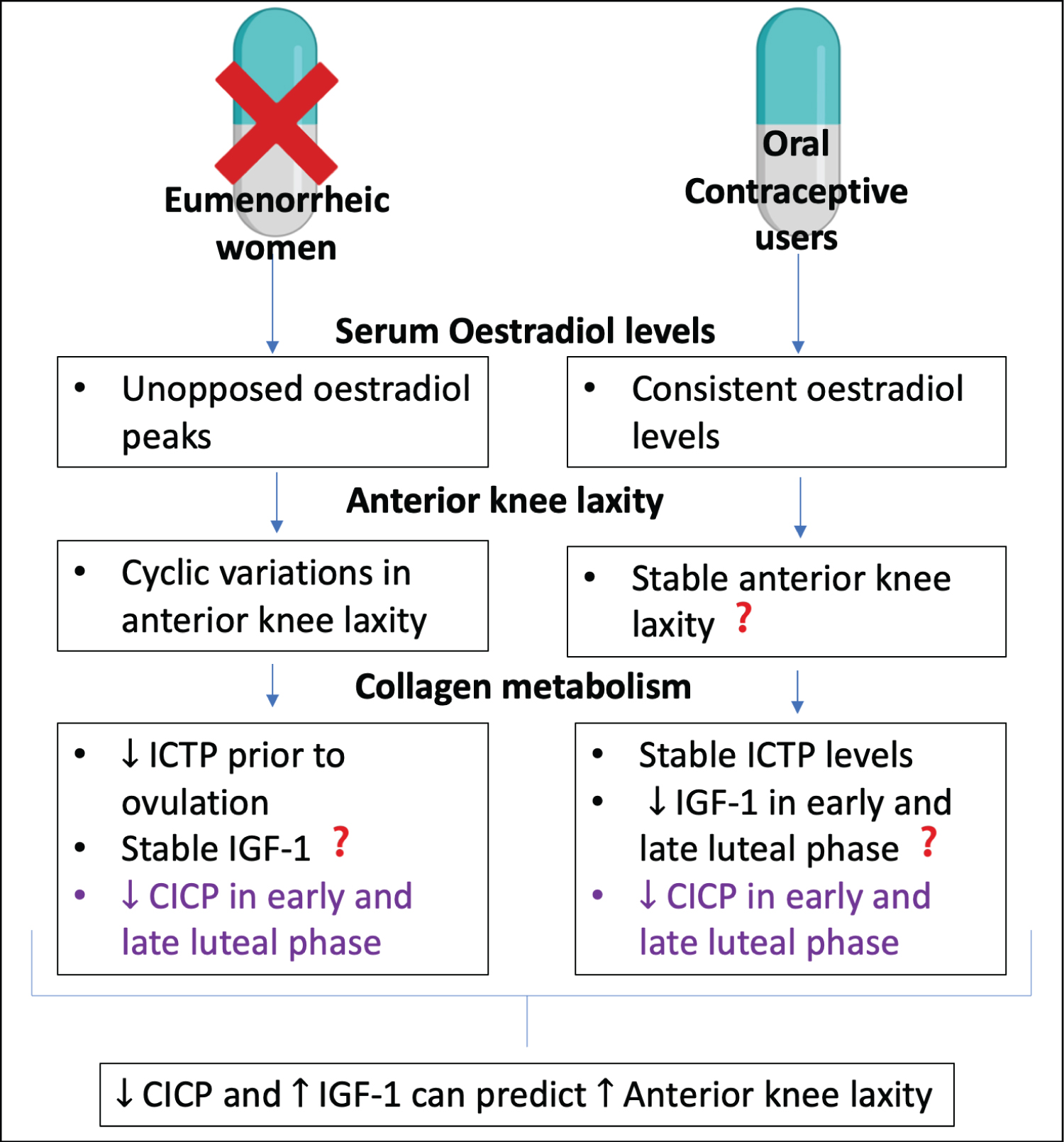 In vivo studies-humans : In a preliminary study, Shultz, et al. (2012), aimed to identify the effects of alterations in sex hormone concentrations across the menstrual cycle on both knee laxity and type I collagen metabolism [32]. They also hypothesised that cyclic changes in collagen metabolism could be associated with cyclic changes in anterior knee laxity. Healthy, eumenorrheic females were compared to females using oral contraceptives. Assays measuring sex hormones including estradiol, and serum markers of collagen synthesis and degradation (C-terminal propeptide of collagen type-I (CICP) and insulin growth factor-1 (IGF-1)), and collagen degradation marker (Carboxyterminal telopeptide of type I collagen (ICTP)) were measured. Prior to ovulation, the estrogen surge on days corresponded with decreased ICTP levels and were significantly lower (p < 0.05) than in the oral contraceptive users. CICP concentrations were significantly decreased (p < 0.001) in the early luteal and late luteal phases in both groups compared to in the days of menses and estrogen surge. In eumenorrheic females, IGF-1 levels remained stable (p = 0.558), whilst there was a decrease in the luteal phase (p < 0.001) in oral contraceptive users who therefore had lower IGF-1 levels than eumenorrheic females. Anterior knee laxity remained stable in oral contraceptive females (p = 0.429) but increased in the early and late luteal phase in eumenorrheic females (p = 0.029). Importantly, bivariate correlations, taking into consideration patterns of variability, revealed that decreases in serum CICP and increases in serum IGF-1 could predict anterior knee laxity increases in both groups (p = 0.014).