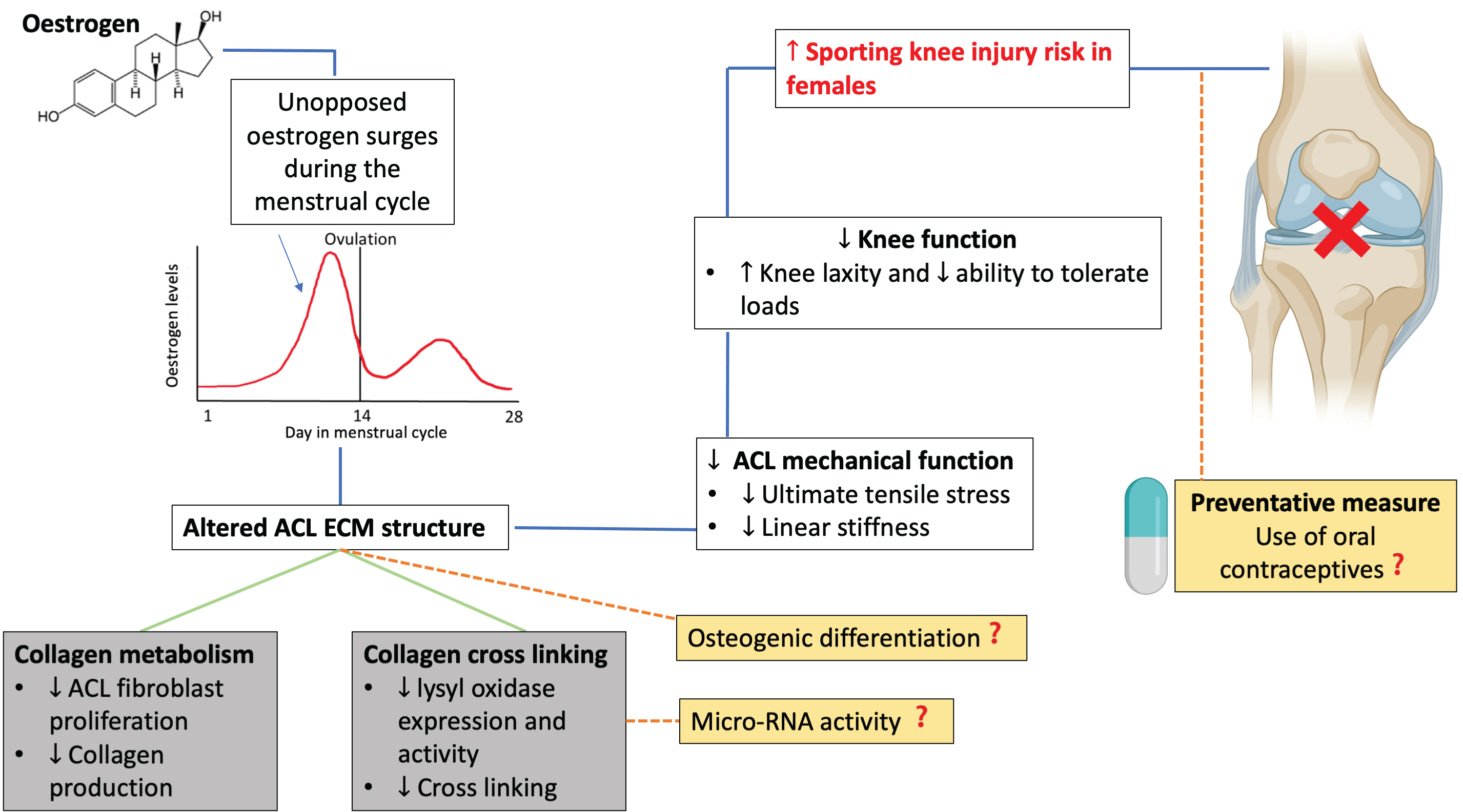 During the menstrual cycle, unopposed surges in estrogen occur, such increases in concentration have been linked with altered ACL ECM structure which in turn, decreases the mechanical function of the ACL. Overall, this is associated with decreased knee function due to increased knee laxityand thus potential increased risk of sporting knee injury in females.In grey are proposed mechanisms by which estrogen effects ECM structure, however the extent to which each mechanism plays in altering knee function is not conclusive . In yellow are areas that should be considered for future experiments both with regards to mechanisms of action by which estrogen impacts ACL structure, and preventative measures such as use of oral contraceptives. Original figure made using Biorender.com (Figure 3).